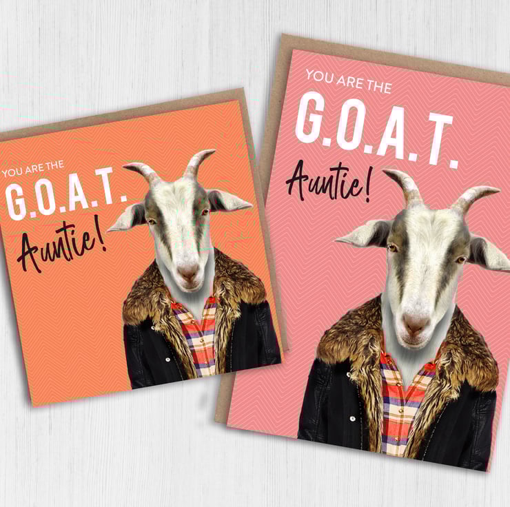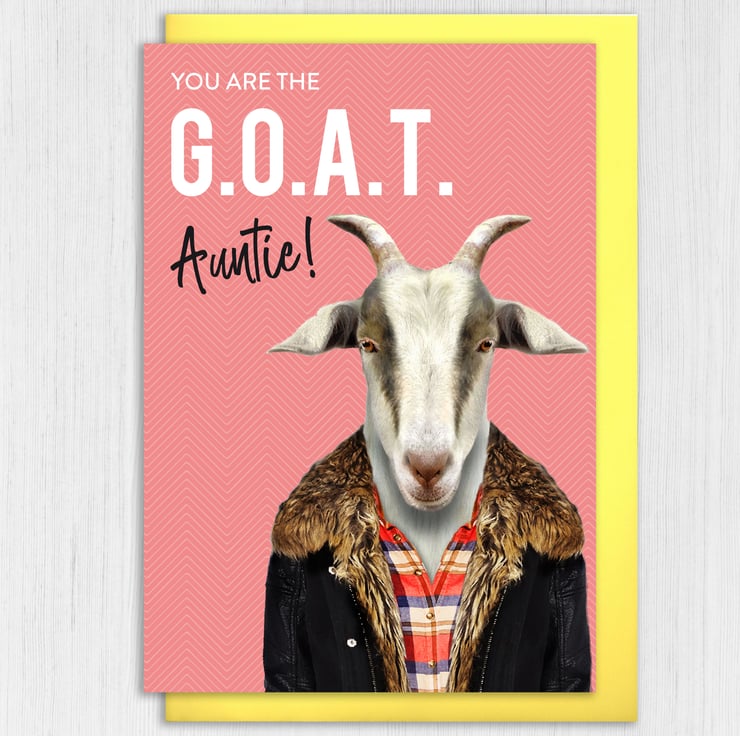 Goat in clothes birthday card for auntie: Greatest of All Time (G.O.A.T) Auntie (Animalyser) (Size A6/A5/A4/Square 6x6")