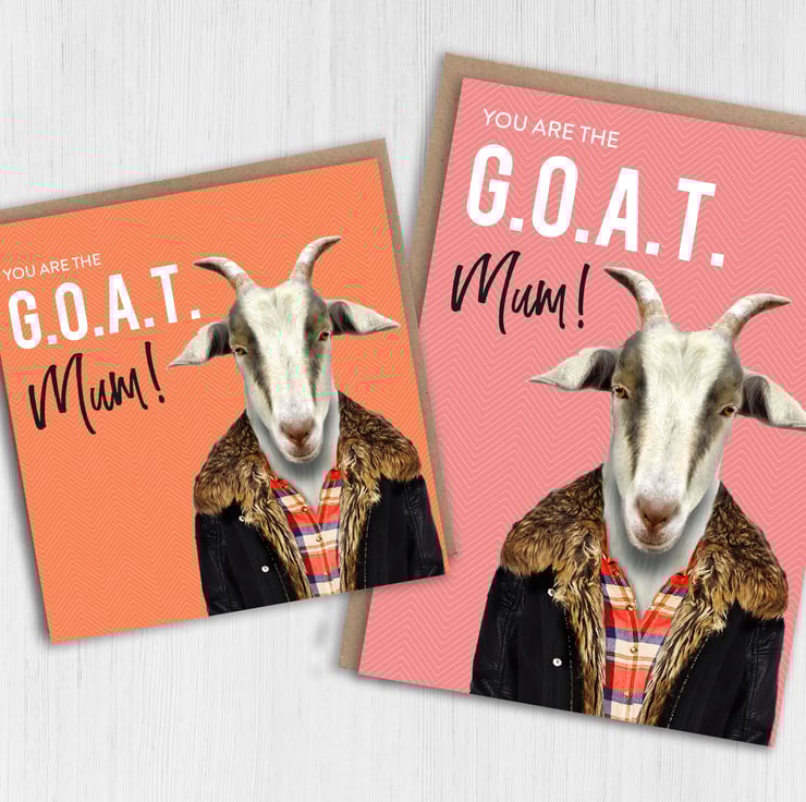 Goat in clothes birthday card for mom, mother: Greatest of All Time (G.O.A.T) Mum (Animalyser) (Size A6/A5/A4/Square 6x6")