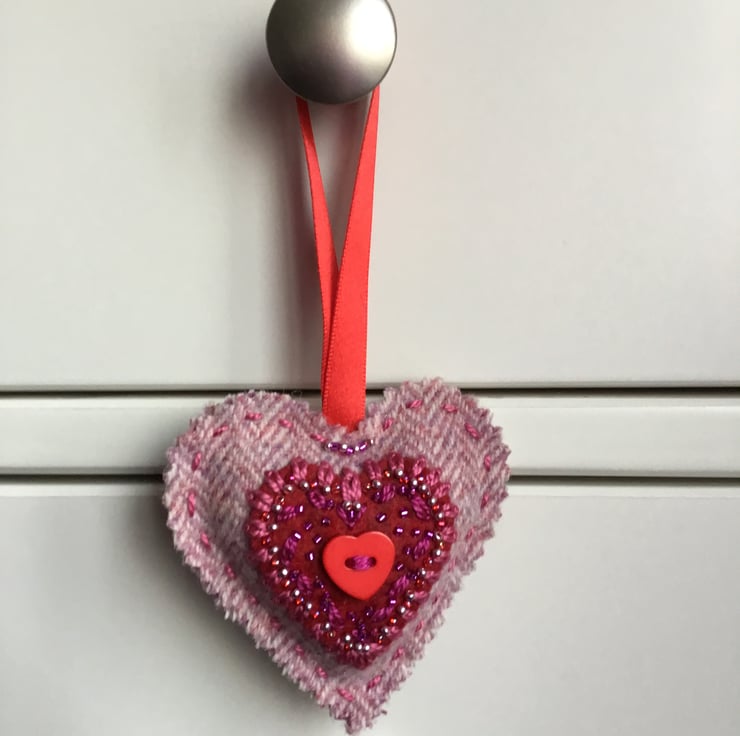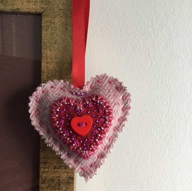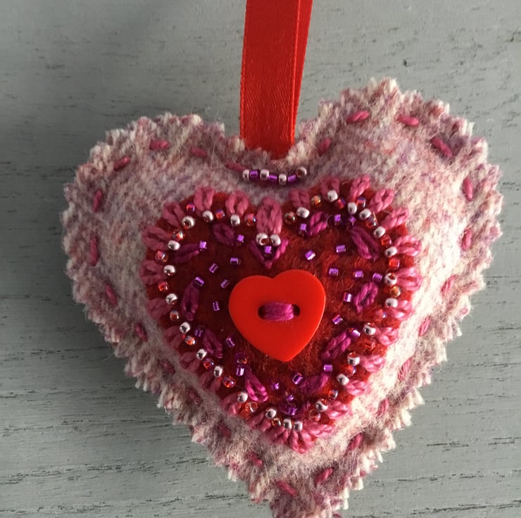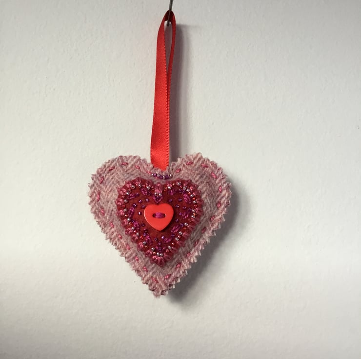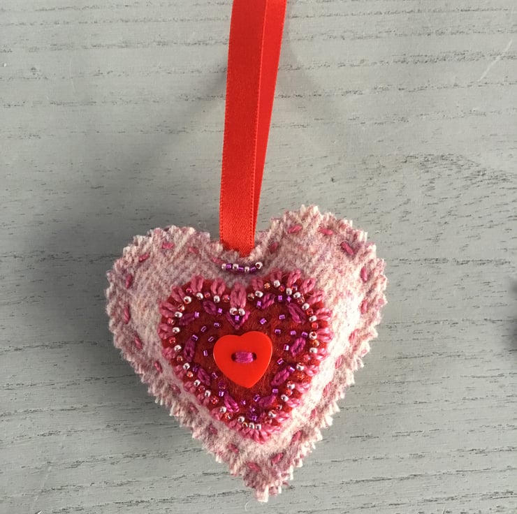 This Hand Embroidered Hanging Heart Decoration in red and cream herringbone fabric, has a red Heart button, stitched onto a red felt Heart shape. Hand embroidered Lazy-Daisy Stitches in red and pink embroidery threads surround this Heart button. This Hand Embroidered Hanging Heart Decoration is padded, like a cushion. A long red satin ribbon hanging loop is at the top, secured with seed beads. This ribbon extends down the back of the Heart, decorated with a little wooden Heart button. Hand embroidered Running Stitches in pink thread edge the Heart…..giving it a heritage and vintage feel.