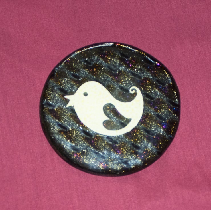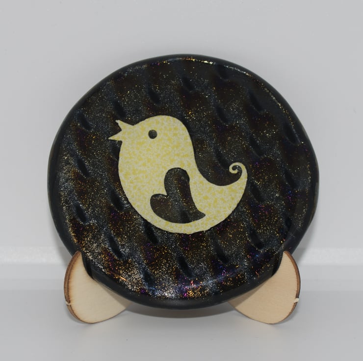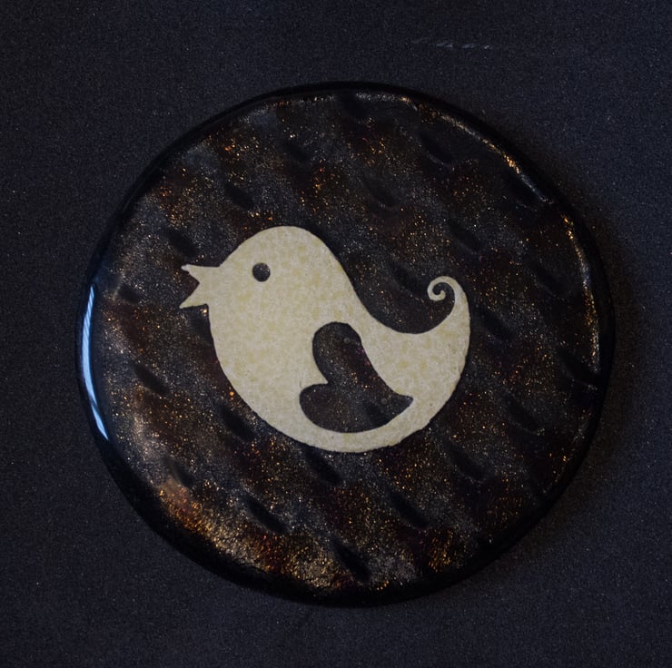 This different coaster has a single lovebird inclusion made from punched metal foil.