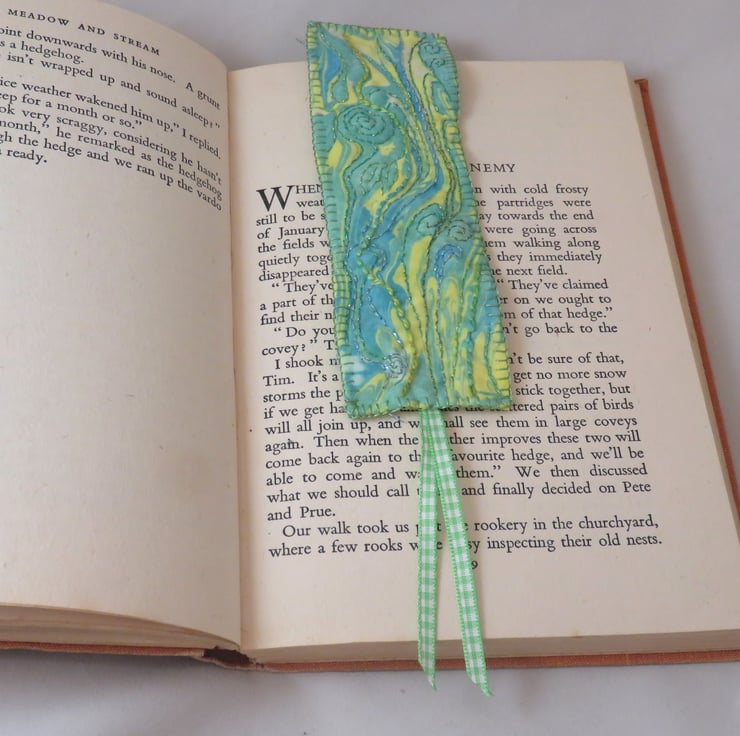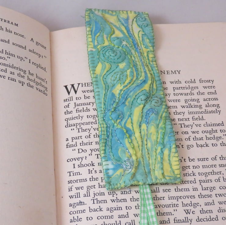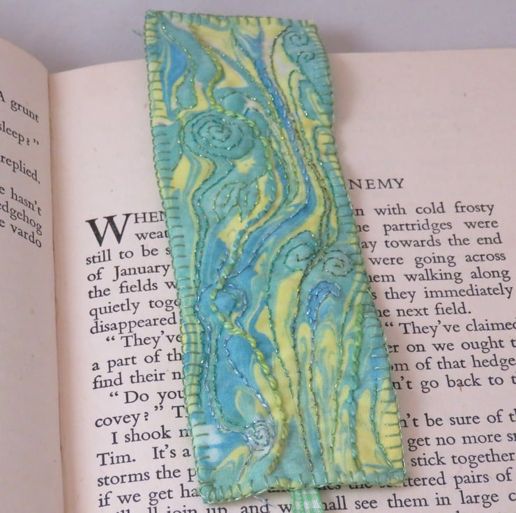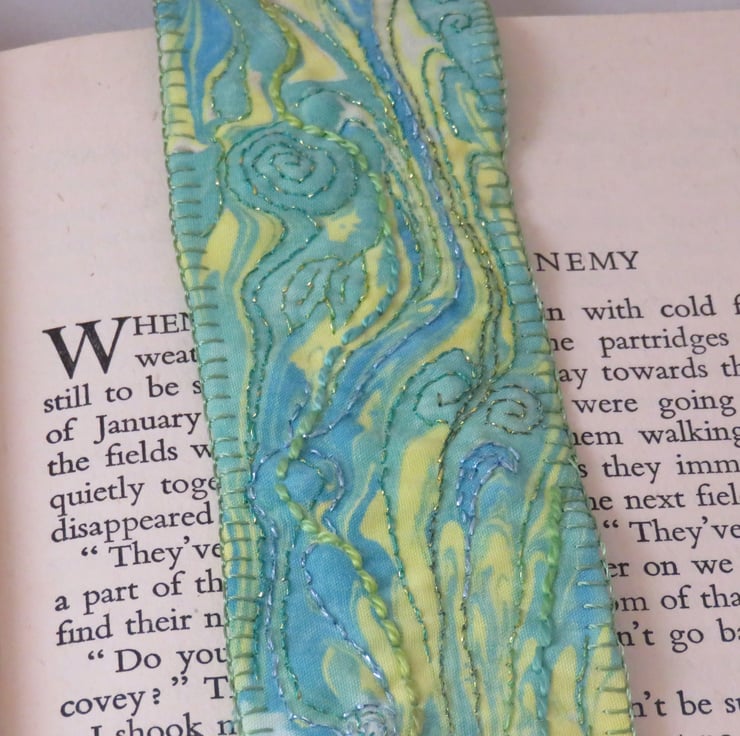 A piece of cotton fabric was marbled in shades of blue and yellow - resulting in the addition of a lovely blend of greens. A portion of the fabric was selected for this bookmark. The swirly pattern has been enhanced by simple hand embroidery - using a space dyed cotton perle in shades of blue and green, together with metallic threads in shades odf green blue and gold. The stitching gives textural interest.