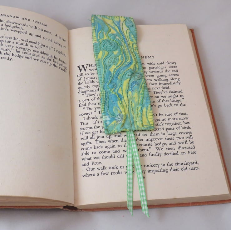 A bookmark of hand embroidered marbled fabric - each one unique.