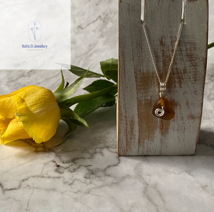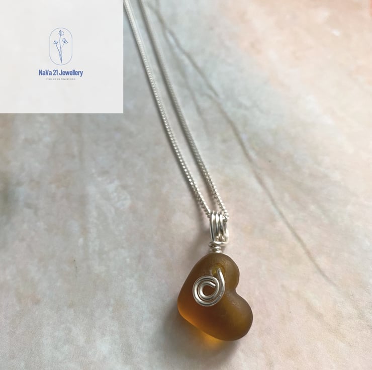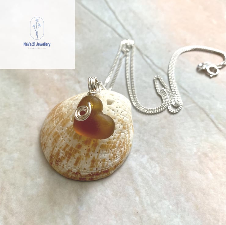 Wire wrapped Amber Seaglass heart pendant