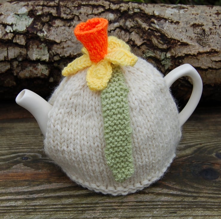 A lovely tea cosy knitted using a gorgeous West Yorkshire Spinners blue faced Leicester wool yarn used double. Topped with a knitted daffodil flower with yellow petals and an orange trumpet in acrylic yarn.