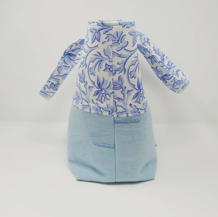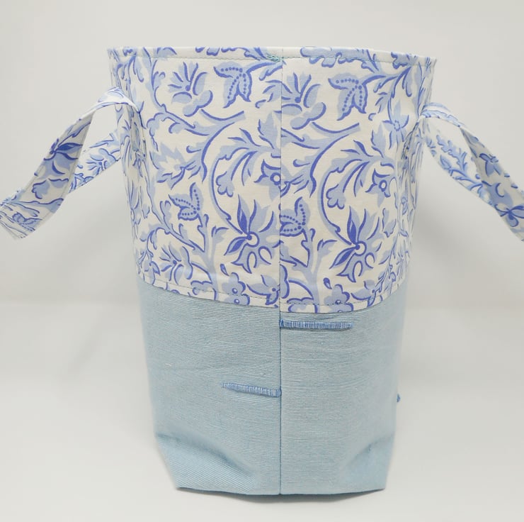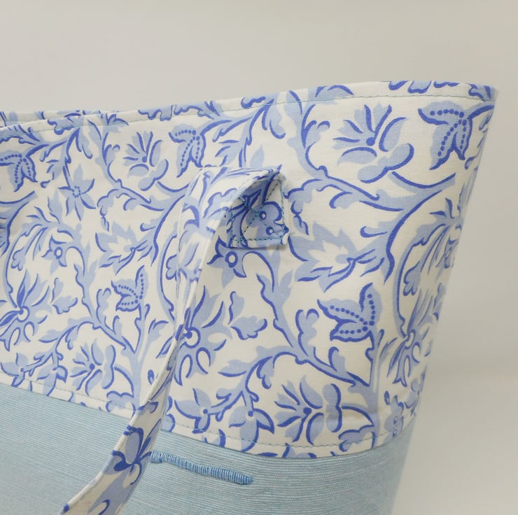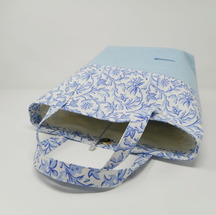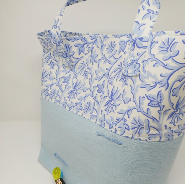 The top panel is a floral all over print from Laura Ashley. Leaves and flowers in two shades of blue twist and turn on a white background. The bottom is a handwoven slubbed cotton in a beautiful pale sky blue. The straps are made from the same fabric as the top.