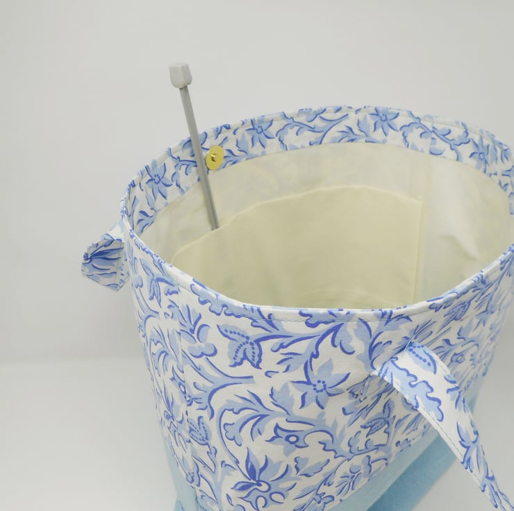 Toulouse tote bag is a perfect knitting, project or book bag, designed with practicality in mind. Made from a mix of cotton fabrics, Toulouse is a medium sized bag with a flat bottom and two short straps, and three internal pockets.