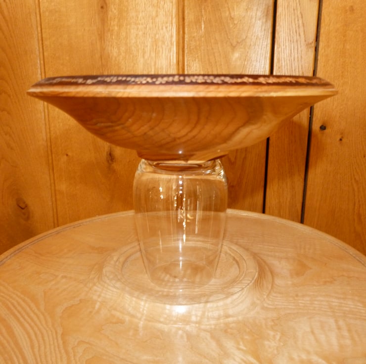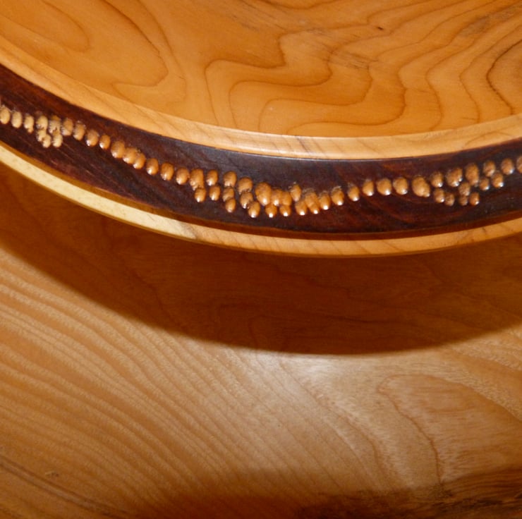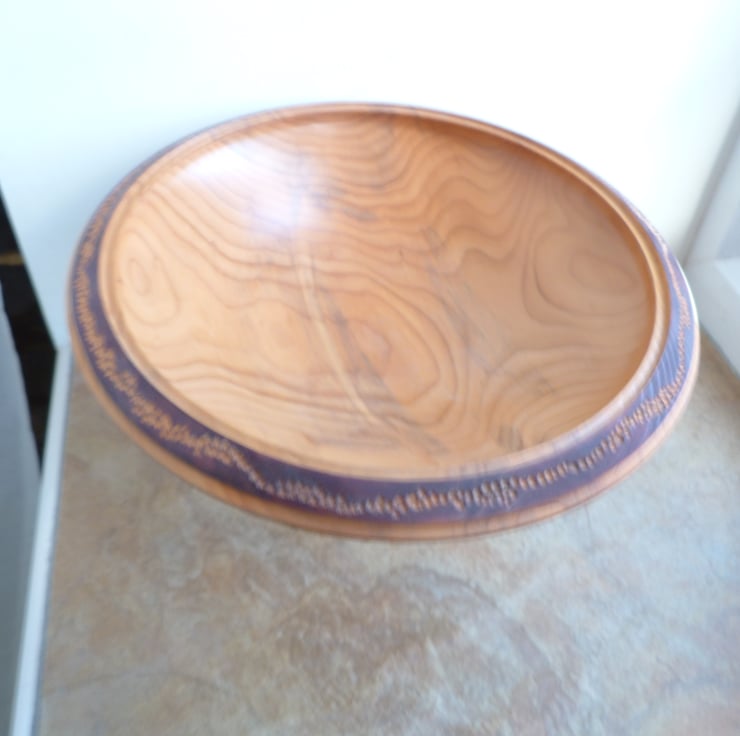 A bowl in beautiful English Yew ,9 1/2" wide 2 3/4" high, the rim is undercut, stained a rusty red then decorated with small round cuts. A not to big piece, useful in the home ,