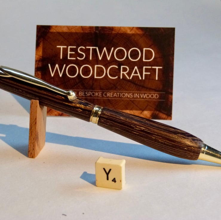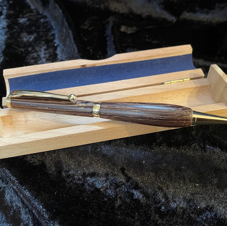 This pen was created using a beautiful hardwood blank with exceptional grain. Operation is a simple twist to reveal a ballpoint,( these are easily replaced). The high polish finish requires no maintenance and the metal work is finished with a gold plating.