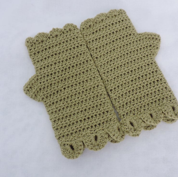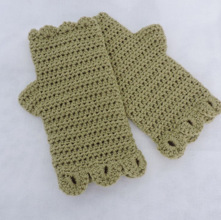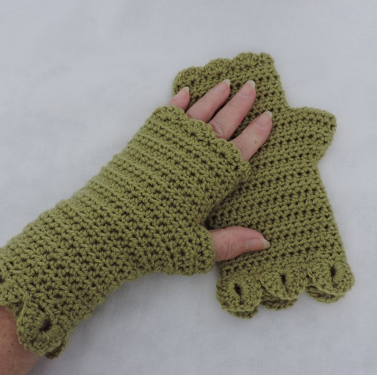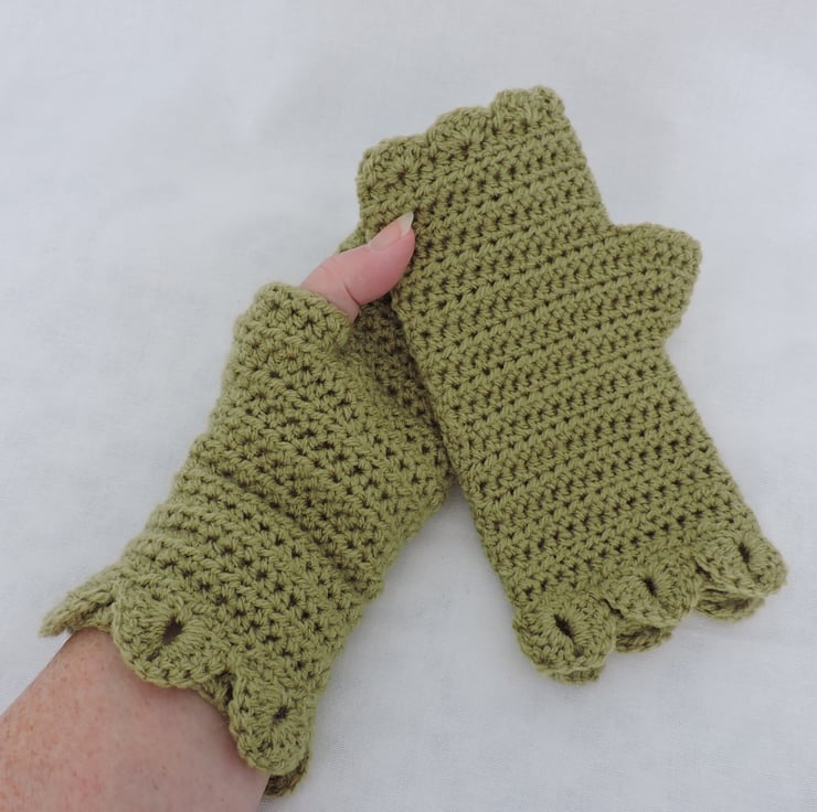 Clearance Sale now £5.00 I have crocheted this pair of adults fingerless mitts with a premium double knit acrylic yarn. A lovely soft olive colour.. They have a plain body with a single row of dragon scales at the cuffs and a wavy edge to the top.. An ideal winter warmer.