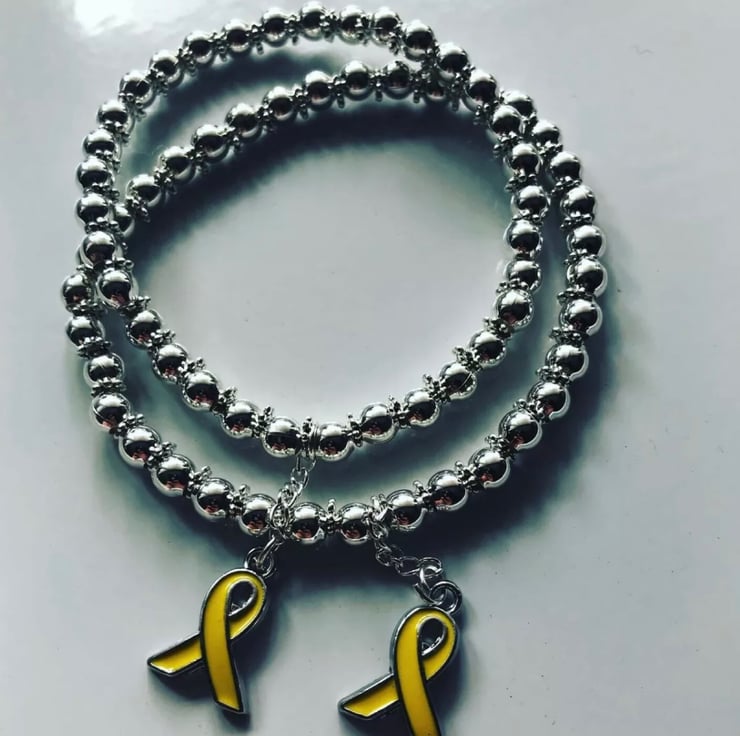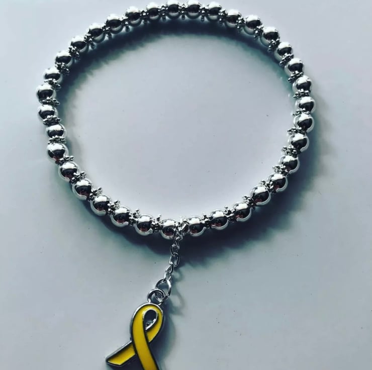 Silvertone beaded stretch bracelet with yellow ribbon awareness charm