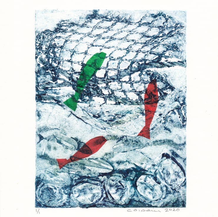 I produced this collagraph plate entirely out of plastics which would normally have been thrown away. The rocks at the bottom are made from blister packs, netting from tangerines, tooth paste tubes,
