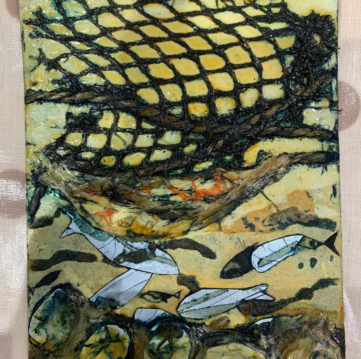 The nets are made from the plastic netting is from fruit bags,the ocean bed is blister packs from pills, cut up toothpaste tubes. Please look at second image of the collagraph plate.