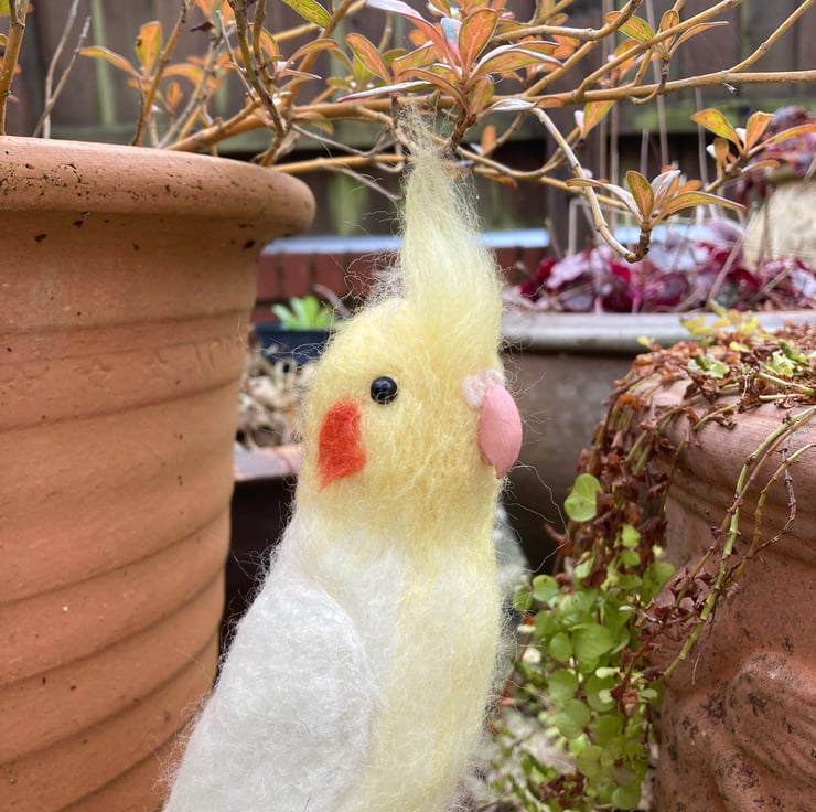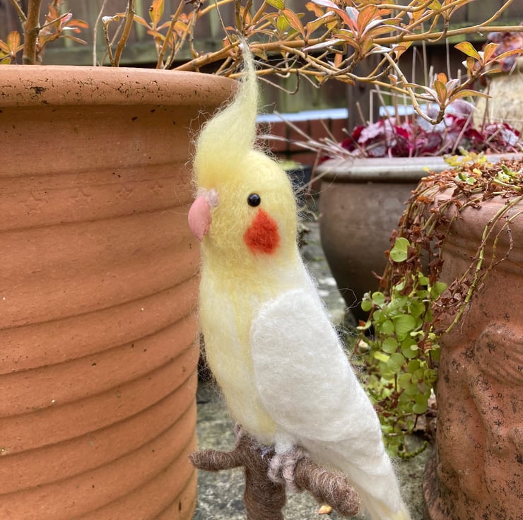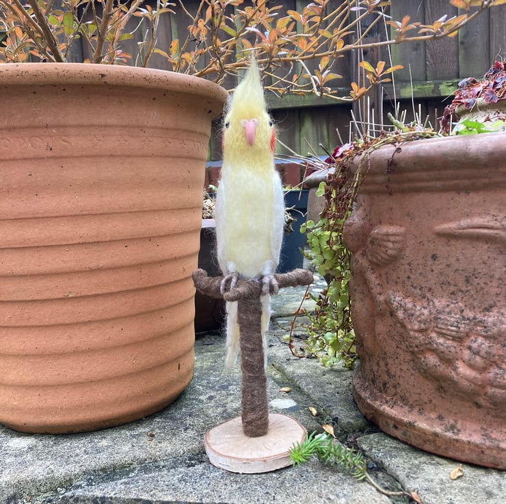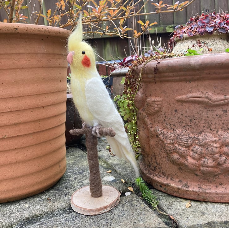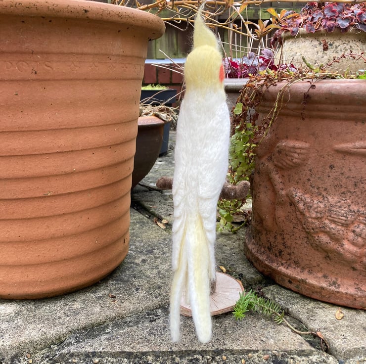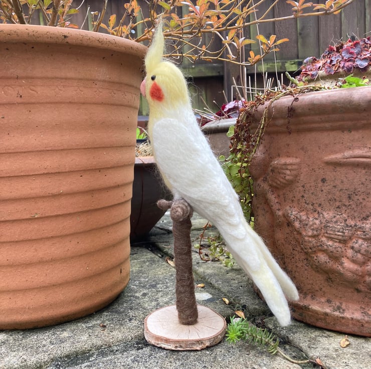 This white version of the much loved cockatiel has been made using a needle felting technique. Woollen fibres have been sculpted into shape using a barbed felting needle. Coloured merino wool fibres have been added to the surface and wings and tail added. The beak is formed from silk clay and the feet from wool wrapped wire. Black acrylic half pearls have been used for the eyes. A needle felted perch mounted on a rustic wooden slice completes the ornament.