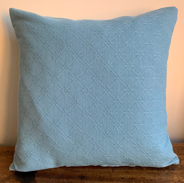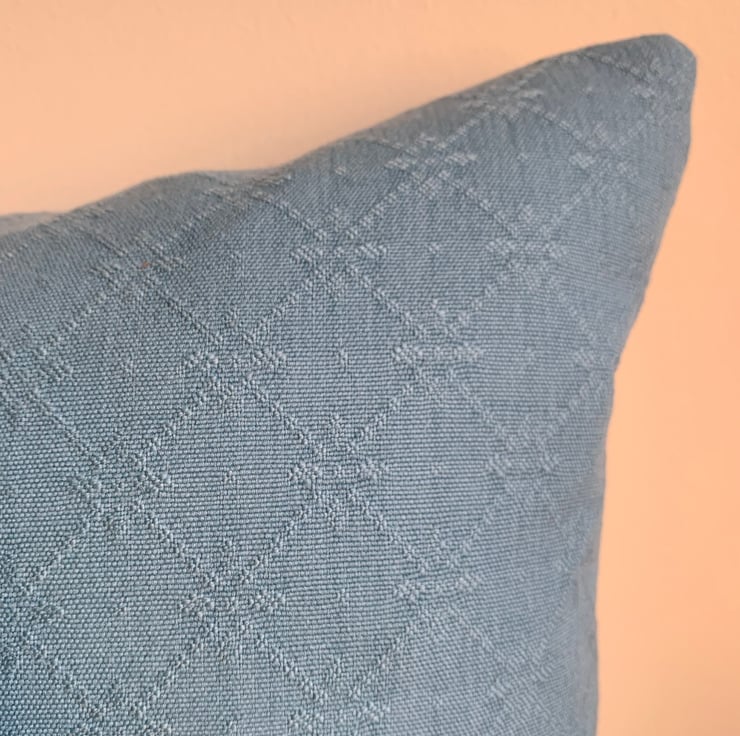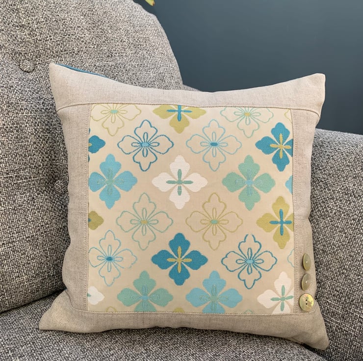 One of a kind cushion cover made from a swatch of Liberty furnishing fabric neatly framed with beige linen and backed with a thick blue Laura Ashley cotton with a criss-cross pattern.