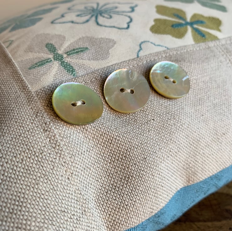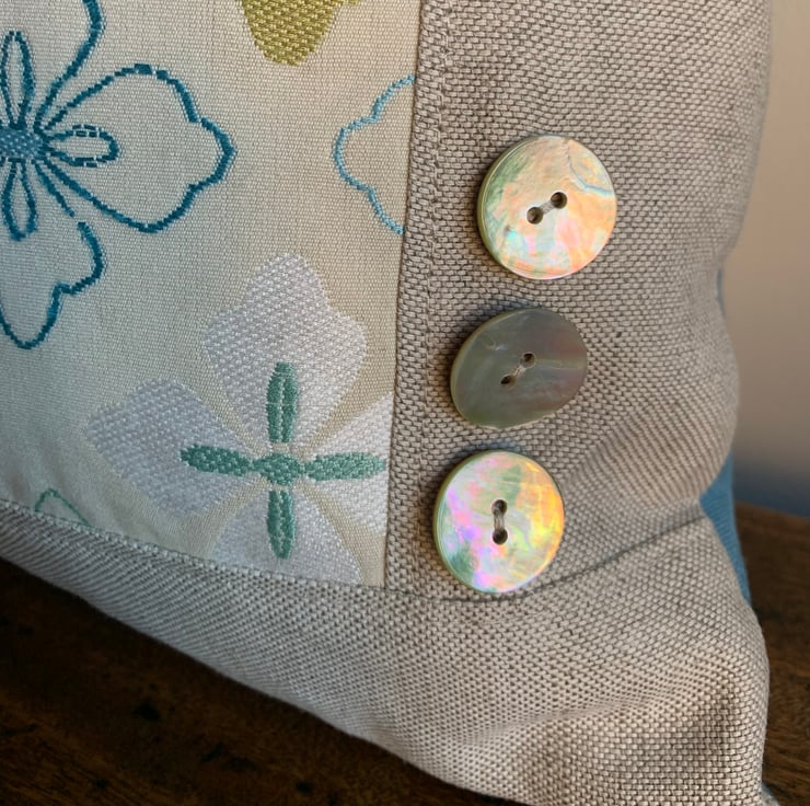 The cover is finished with 3 mother of pearl buttons and fastens with a zip in the bottom seam.