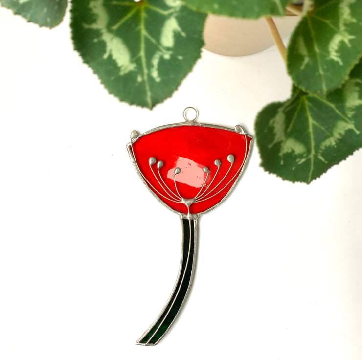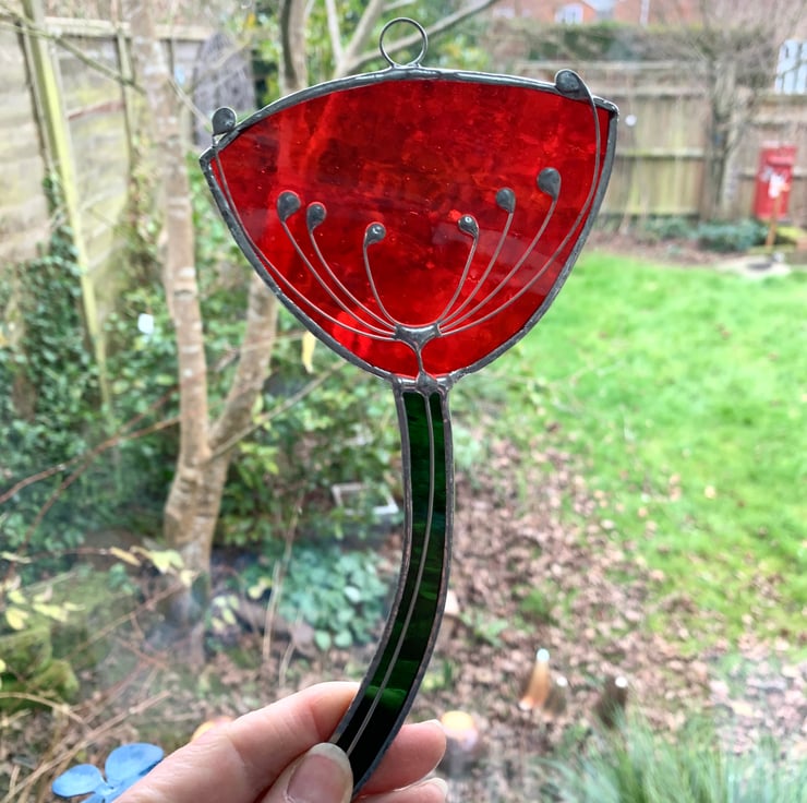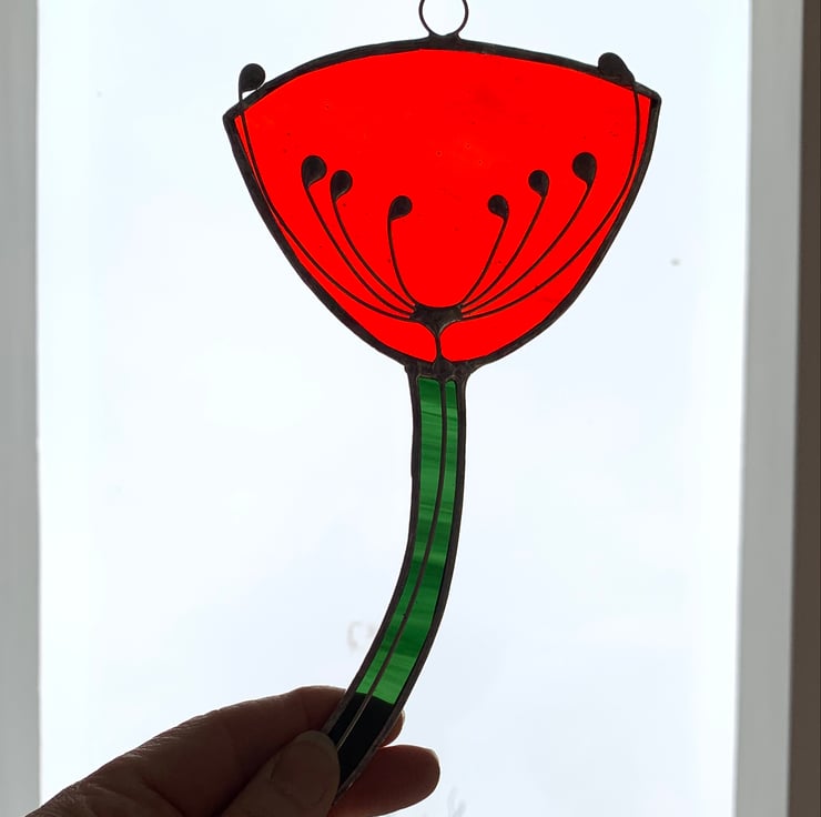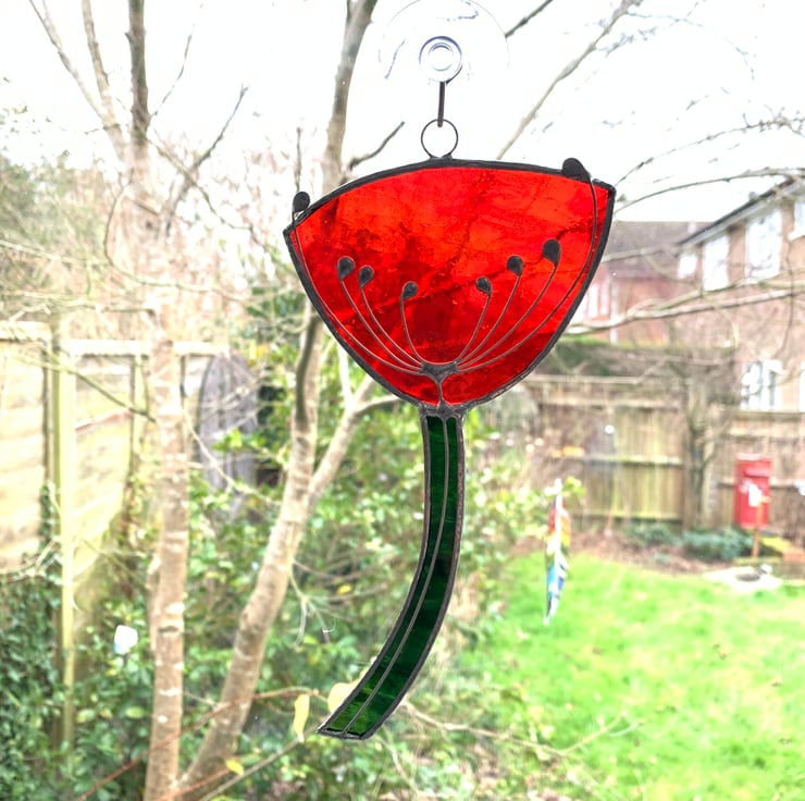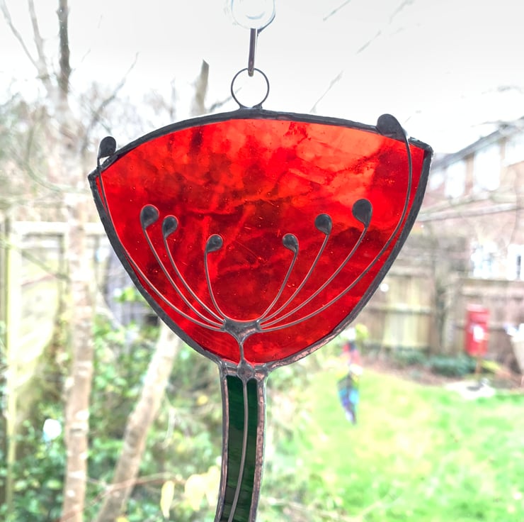 This suncatcher has been made from a lovely red sea glass and green water glass for the stem. The cow parsely has been made from tinned copper wire. Each piece of glass has been hand cut, ground, foiled and soldered together.