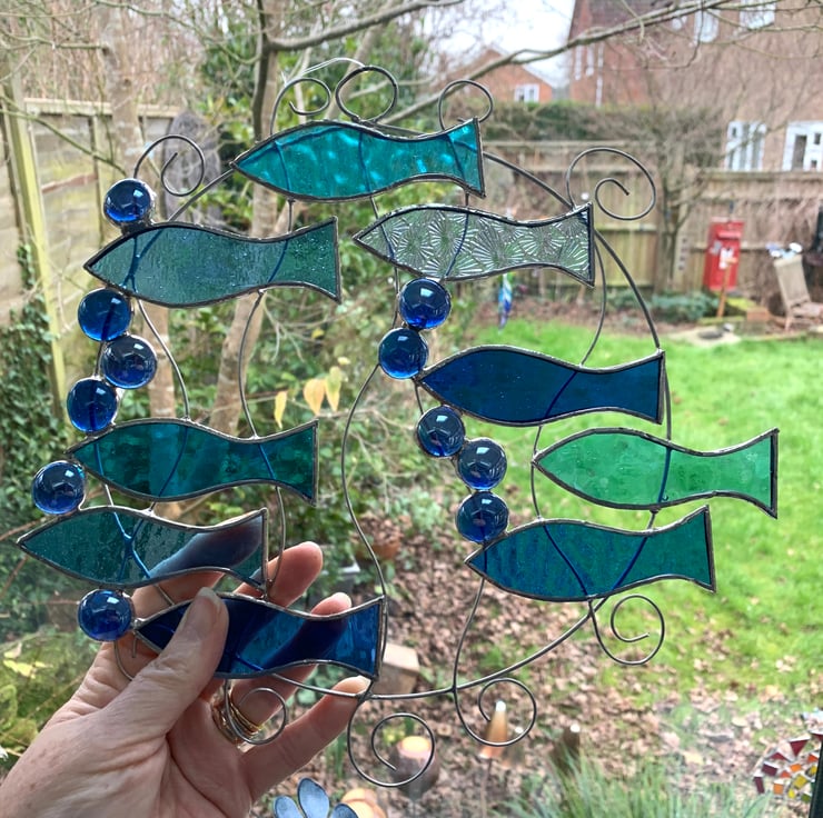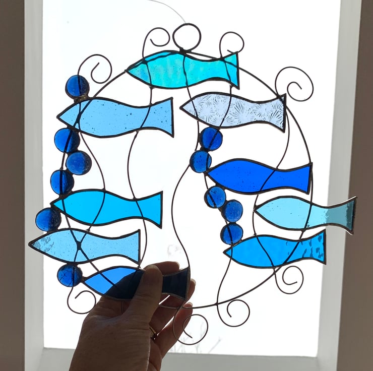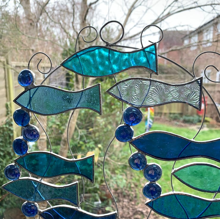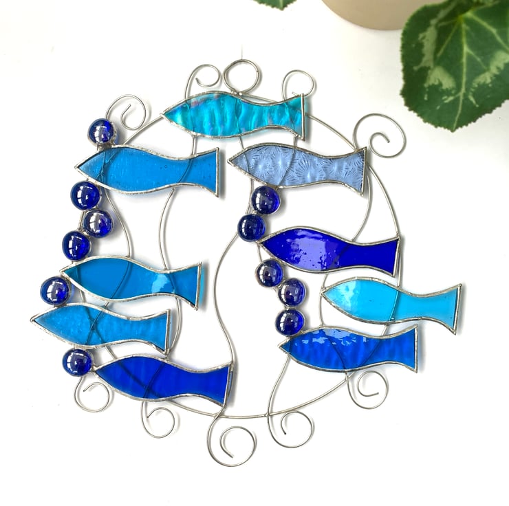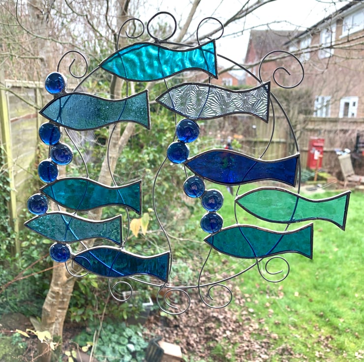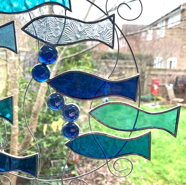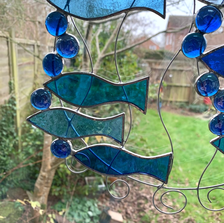 This suncatcher has been made of 9 fish, all made from a different texture/coloured stained glass and 11 blue nuggets for the air bubbles.