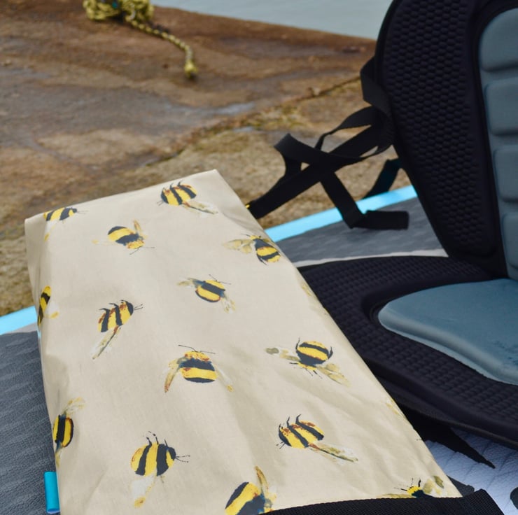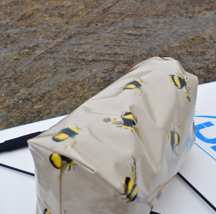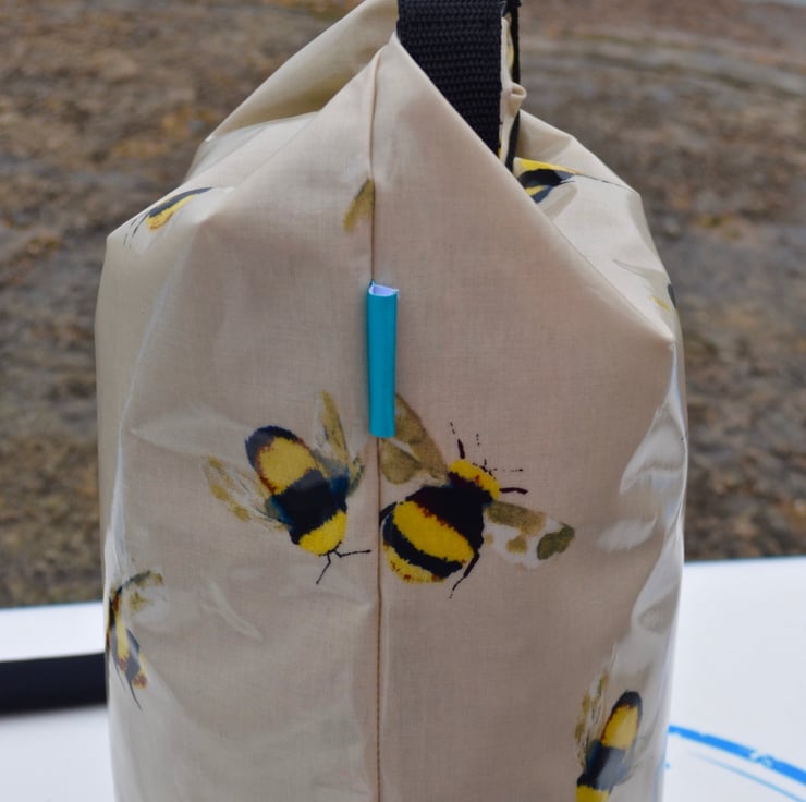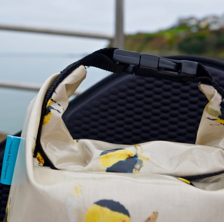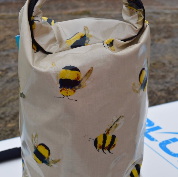 This small size oilcloth fabric bag is ideal for cramming everything you might need for a trip to the gym, swimming pool, beach or a wild swim. The fabric is a high-quality waterproof cotton oilcloth in the lovely bee ( now discontinued) design. It has a showerproof lining in lovely contrasting dark blue water-resistant 100% polyester fabric that will resist the penetration of water The design is based on a traditional 'dry bag' The black coloured handle makes this bag easy to carry and also to hang up. Just squash everything inside, roll down the top and fasten with the clips. It's easy to keep clean, just wipe down with a cloth- the lining can be pulled out and will dry super quick!