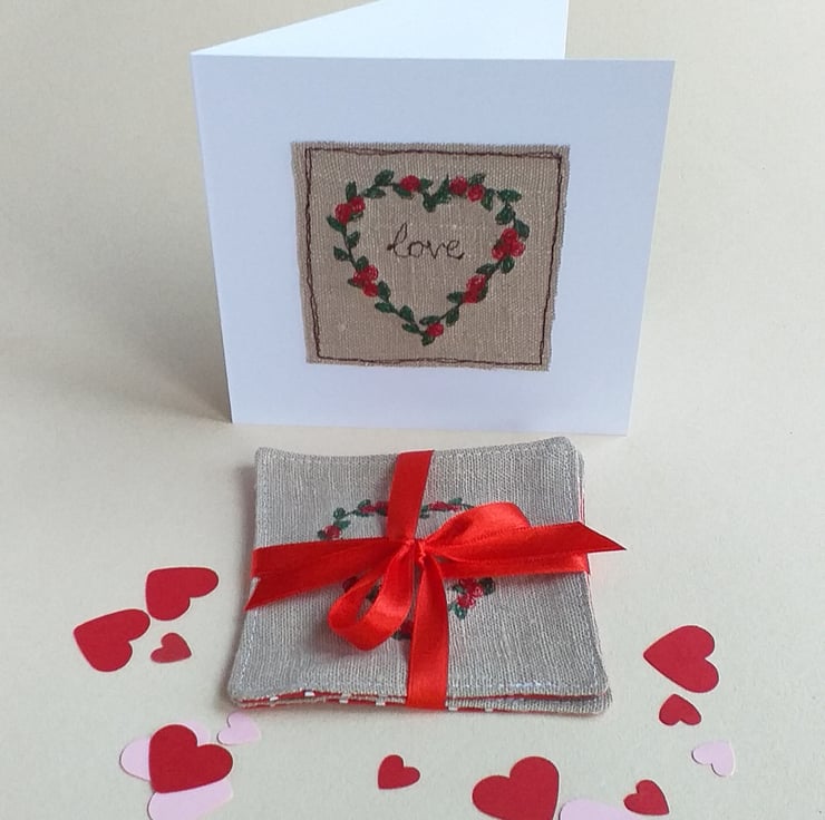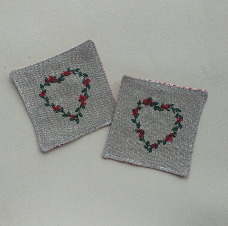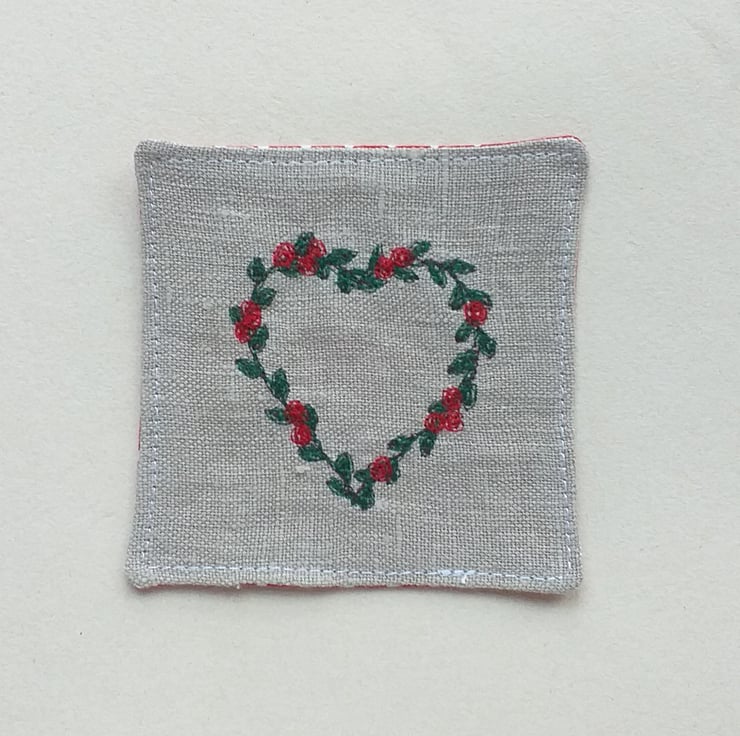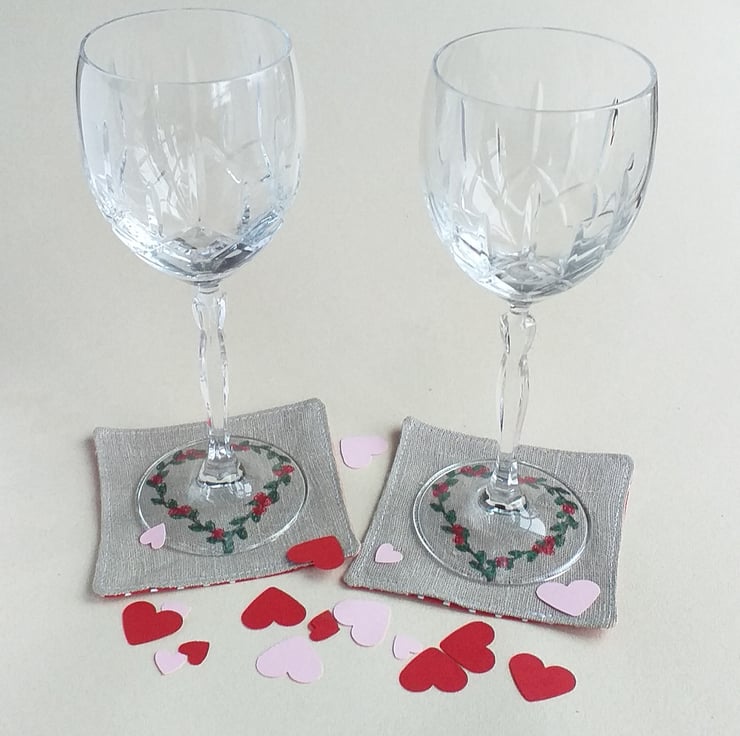 A set of two fabric coasters, with a heart-shaped wreath of foliage and red roses on one side, sewn with free motion embroidery, and on the other side a toning red spotty fabric. These would be perfect for that romantic dinner for two on valentine's day or an anniversary. Also a lovely engagement or wedding gift.