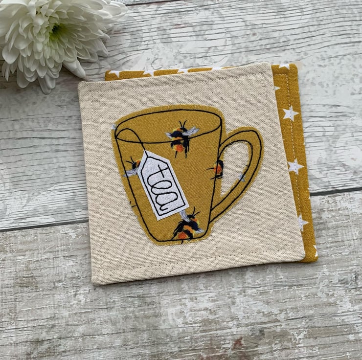 A mug of tea coaster in a mustard bee fabric, a cute gift idea for a tea and bee lover!