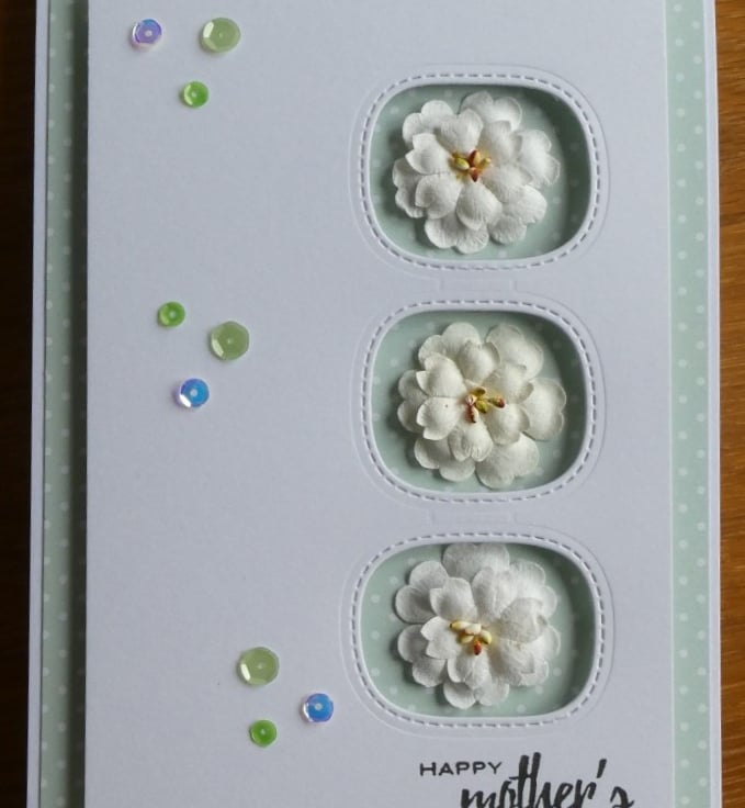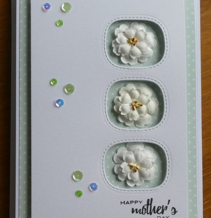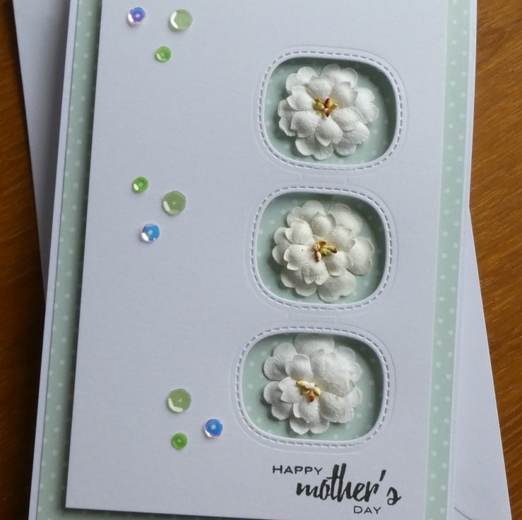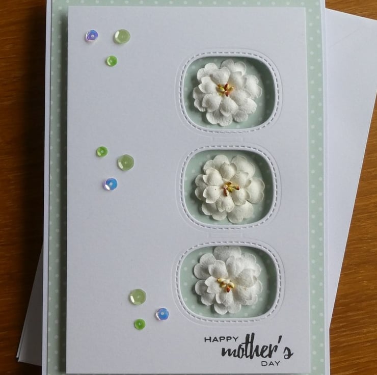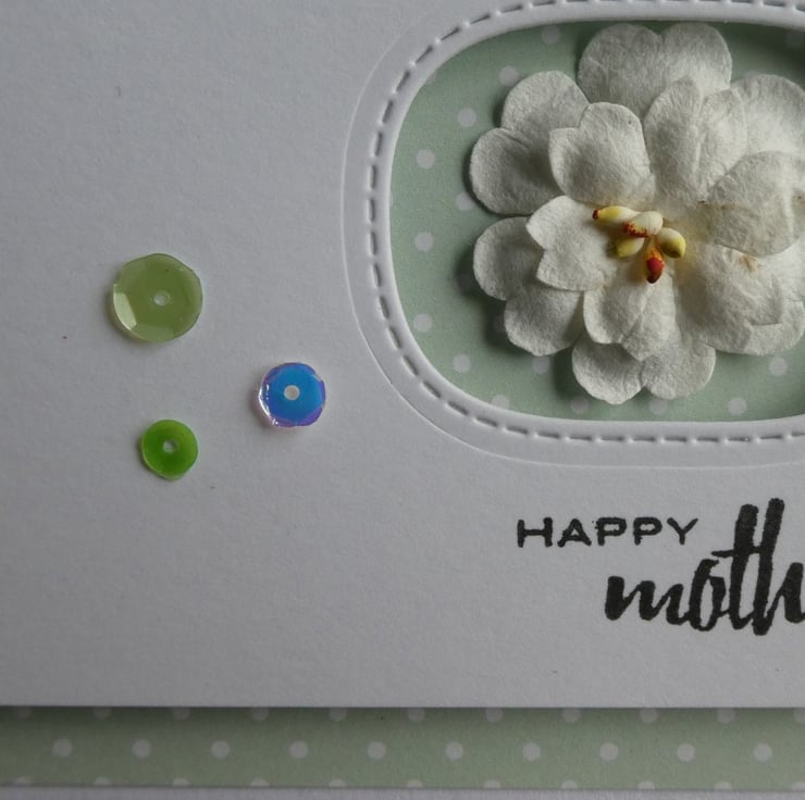 The card has been hand stamped with the greeting Happy Mother's Day and the design has been completed with green and iridescent sequins.