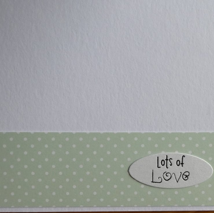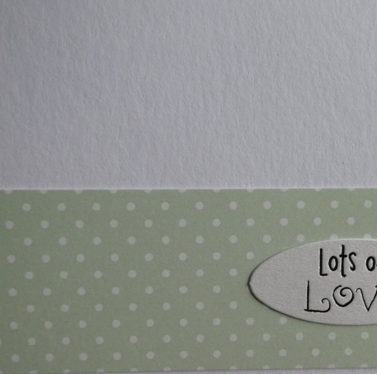 Inside the card is a strip of the same green polka dot card with an oval message with the wording 'Lots of Love' leaving lots of space for your own message.