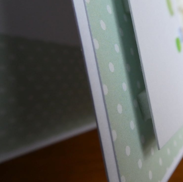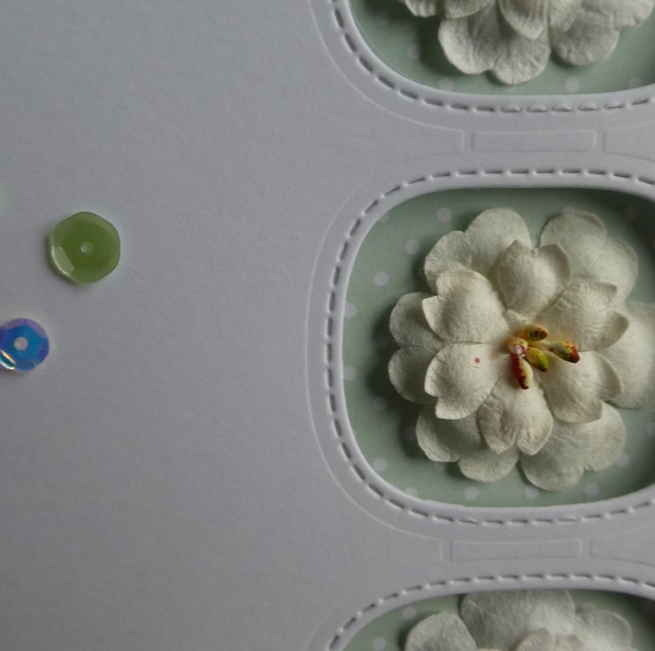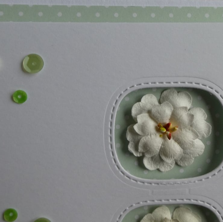 This tent fold card Mother's Day card has a background of pale green and white polka dot card and features 3 soft cream paper flowers. The flowers have been set in apertures in a rectangle of quality white card which has been attached with foam pads to raise it from the card front.