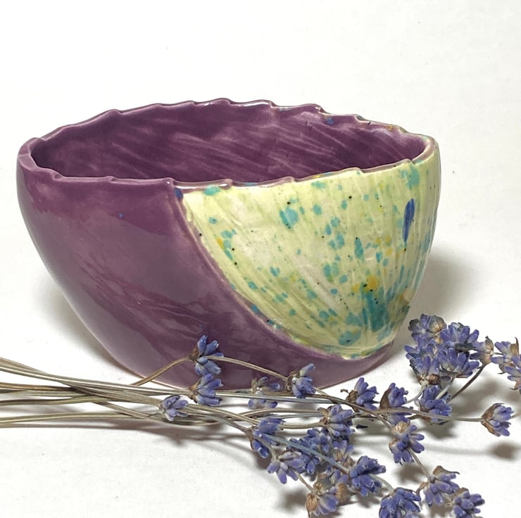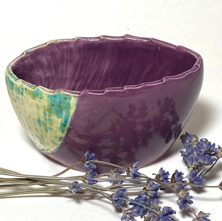 The texture and pattern were carved into the clay at the cheese hard stage and enhanced with meadow green and purple glazes.
