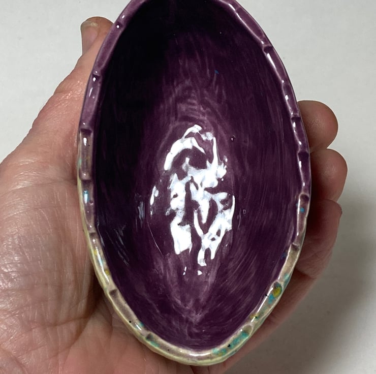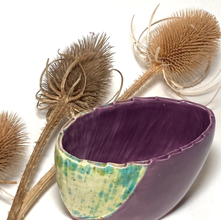 A total one off piece, this charming little elliptical earthenware pot is suitable for tableware, plants or just ornamental.