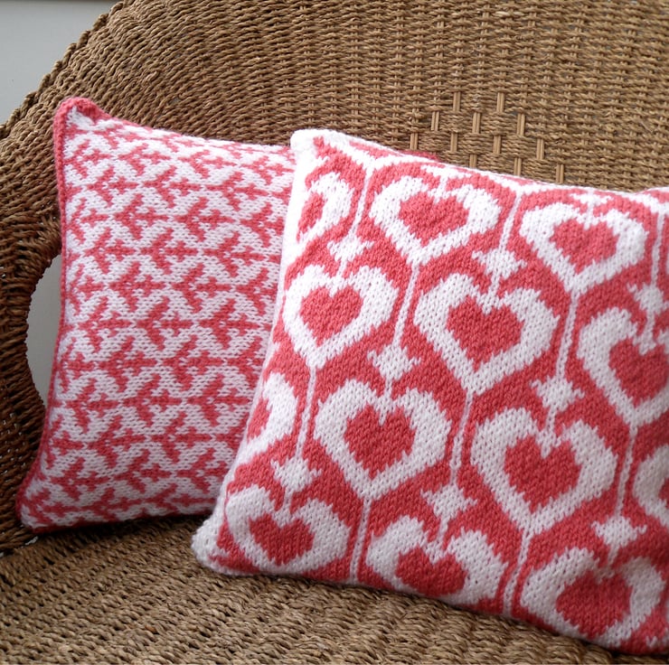 2 unique fair isle designs depicting cupid arrows and valentine hearts are featured on these simple knitted cushions. Each cushion is just 12” x 12”, ideal valentine decor for any room in the house orgarden.