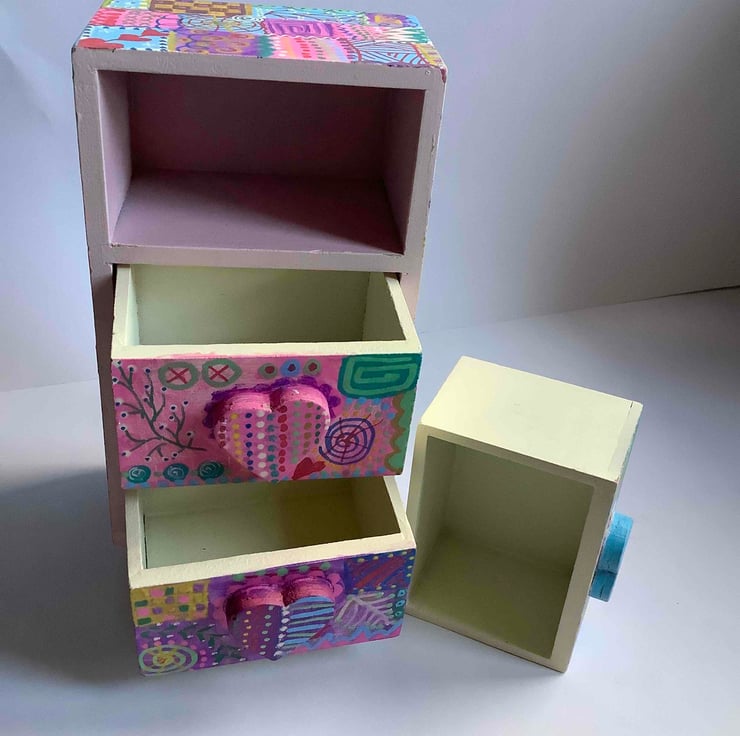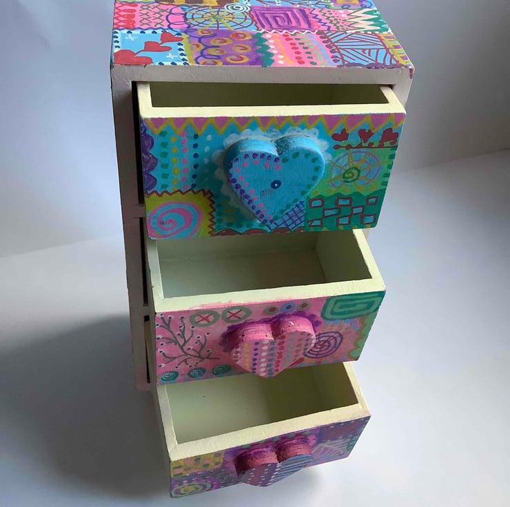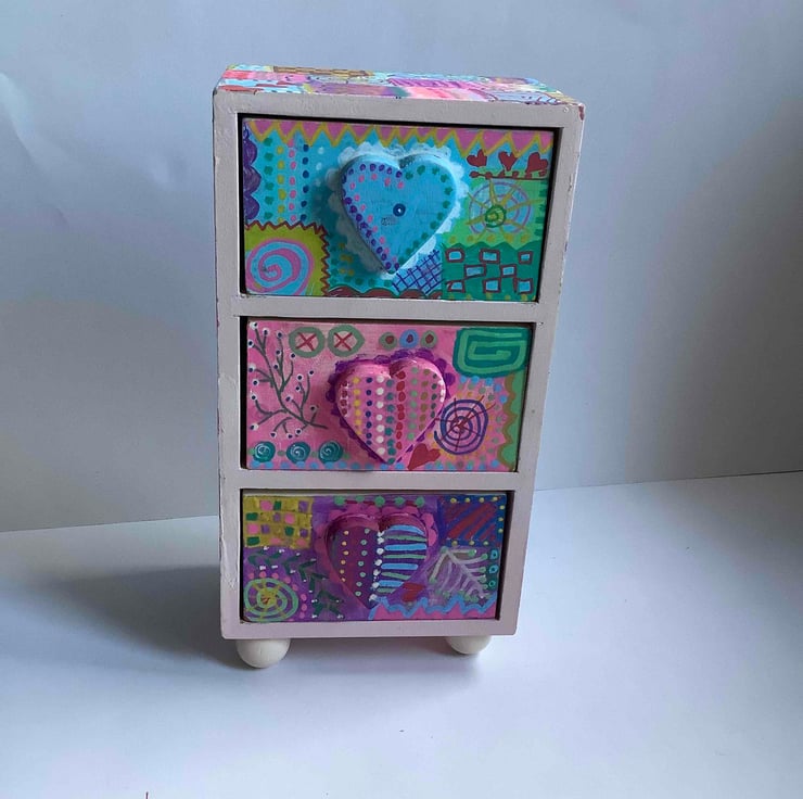 A rescue from being thrown out. This wooden drawer set has 3 little drawers with hearts on the front. The feet are wooden circle shapes