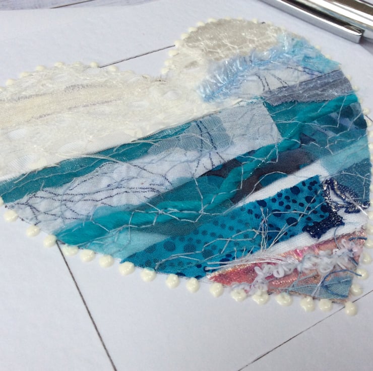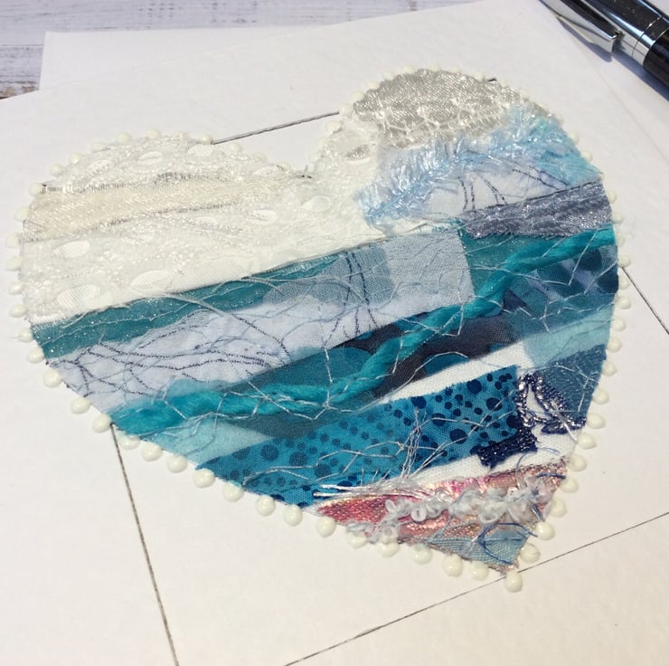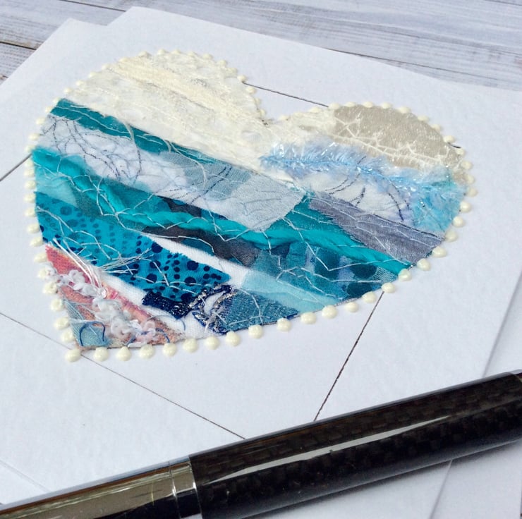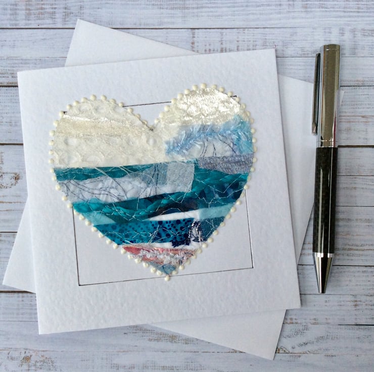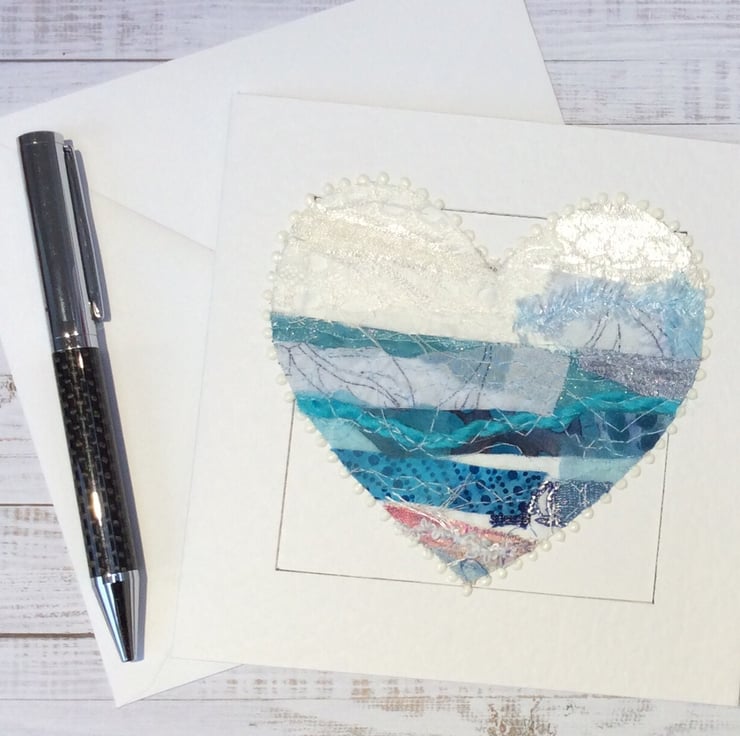 This embroidered heart has been made with my own handmade up-cycled fabric. This beautiful heart has been made into a seascape. It’s made from silk, threads, cottons, lace and netting and it’s been enhanced with free motion embroidery. It’s framed with white dots. It’s perfect for a wedding, anniversary, engagement, Valentines or for someone very special. It is blank inside making it ideal for any occasion. This Hammer White Card measures 14.5 x 14.5cm, comes with an envelop and in a plastic cover for protection.