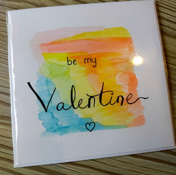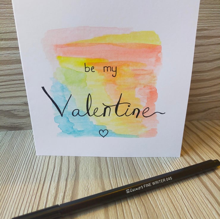 A handmade Valentine's Card with the words "be my Valentine" written onto a watercolour background.
