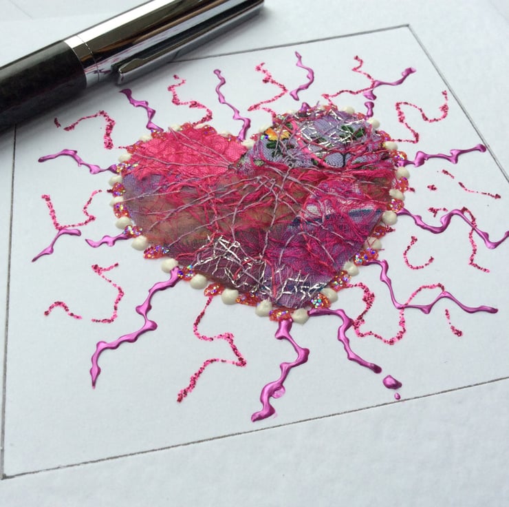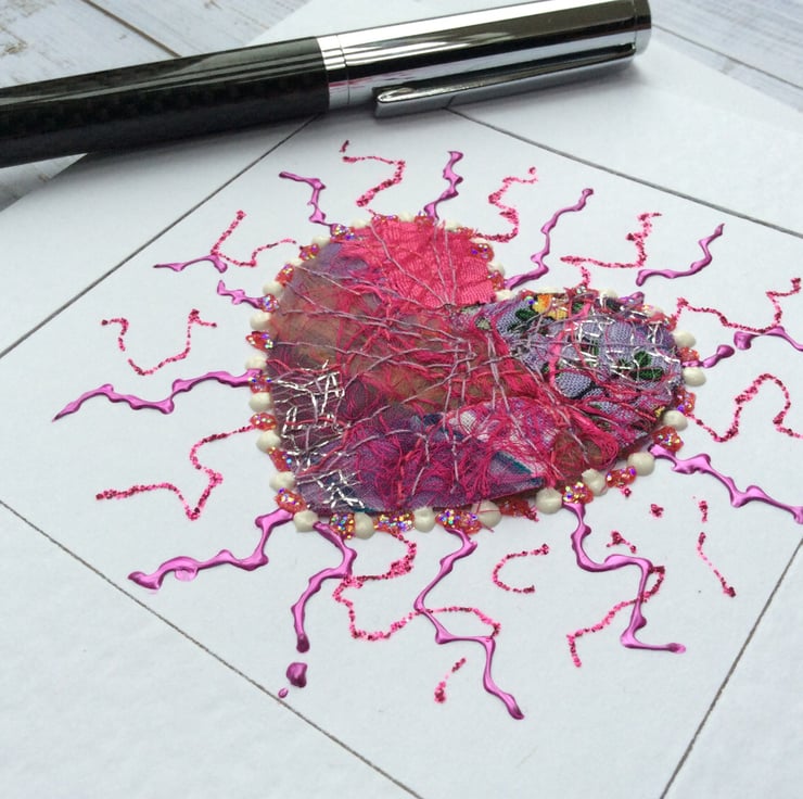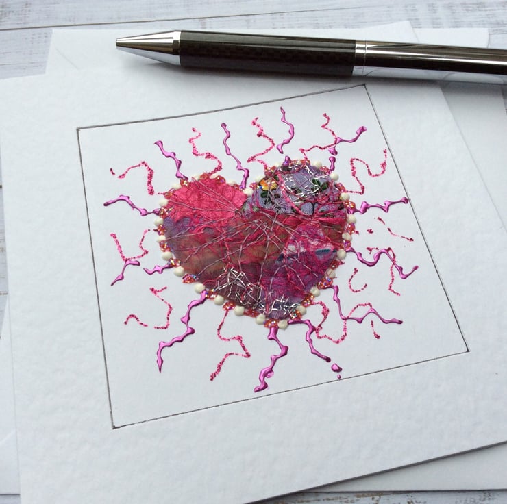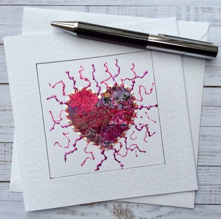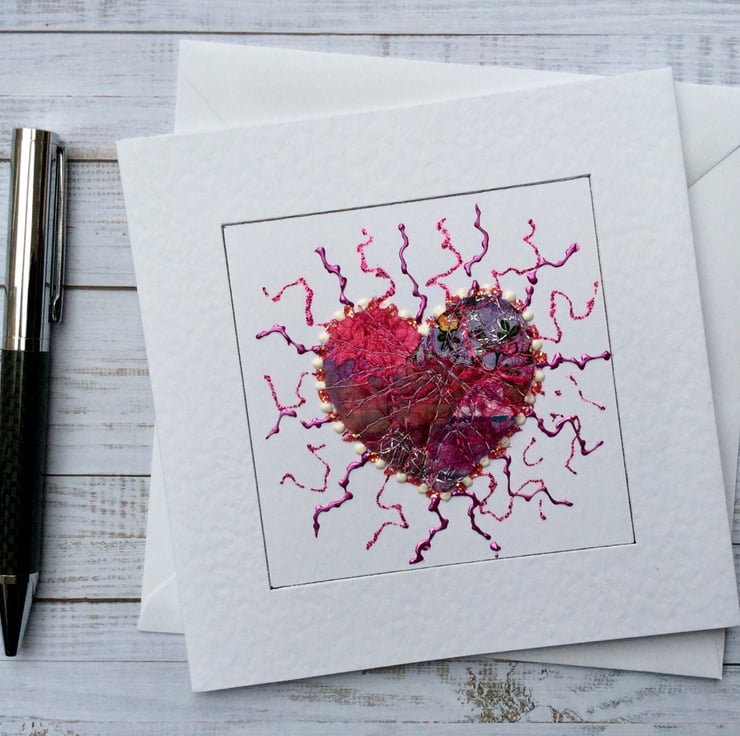 This embroidered heart has been made with my own handmade up-cycled fabric. This stunning fabric heart has a small heart at the centre with pink lines coming out of it like a sun. It’s made from silk, threads, cottons, lace and netting and it’s been enhanced with free motion embroidery. It’s framed with glitter and pearl dots. It’s perfect for a wedding, anniversary, engagement, Valentines or for someone very special. It is blank inside making it ideal for any occasion. This Hammer White Card measures 14.5 x 14.5cm, comes with an envelop and in a plastic cover for protection.