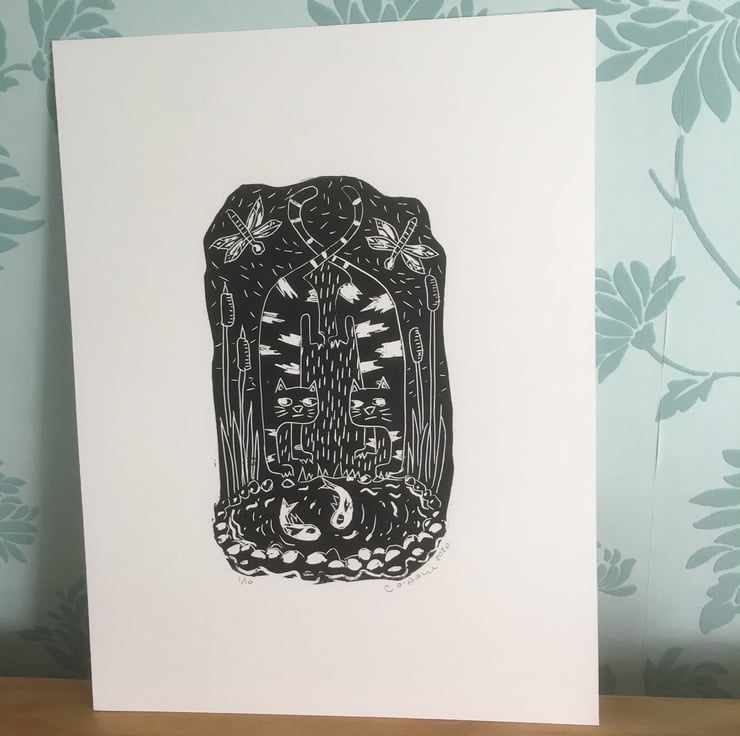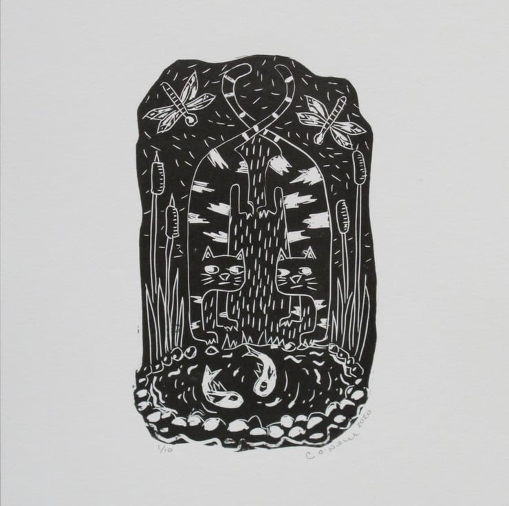 A pair of naughty cats, up to no good. I like to create patterns in my prints and was influenced by the song from The Lady and the Tramp, where there are 2 Siamese cats terrorising a fish. Their tails intertwining mirroring each other.