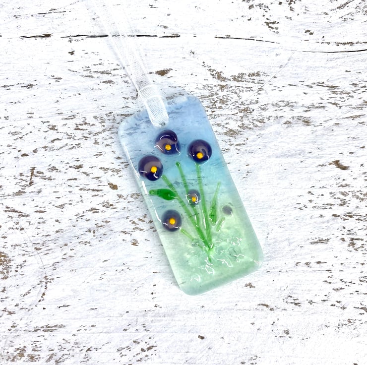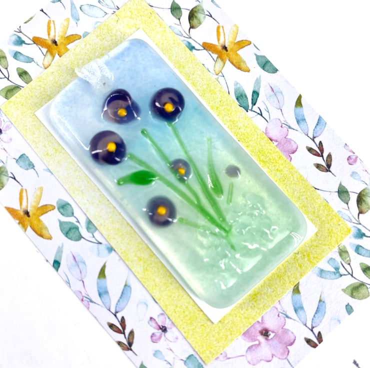 A lovely handmade card with a pretty fused glass floral hanging that can be used as a light catcher or a book mark. The perfect card and gift in one!