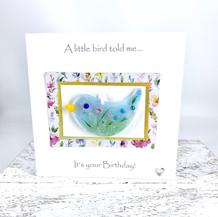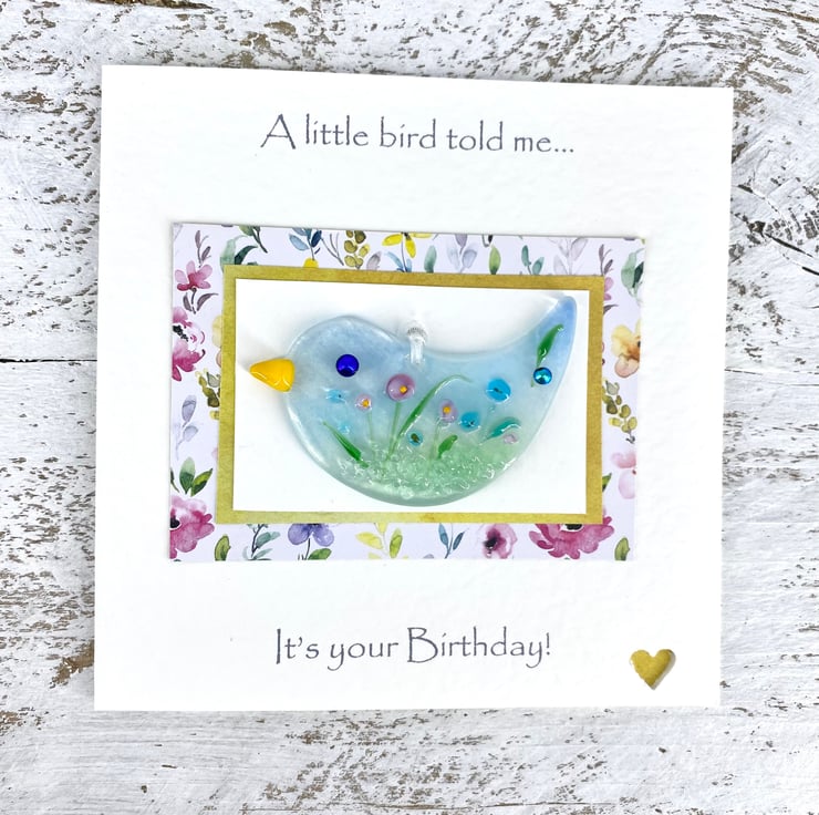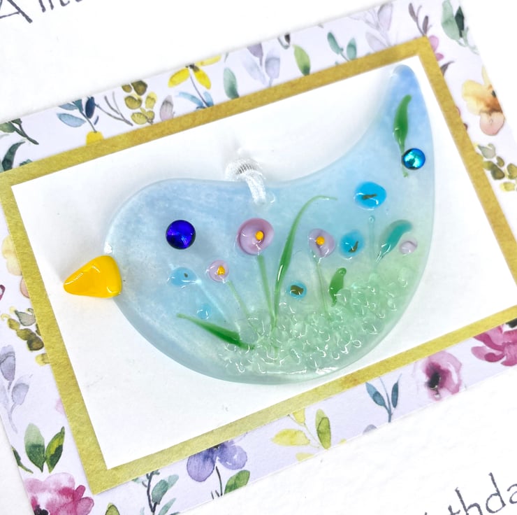 A lovely handmade card with a gorgeous fused glass bird with pretty pink and yellow flowers attached to it - the perfect card and gift in one!