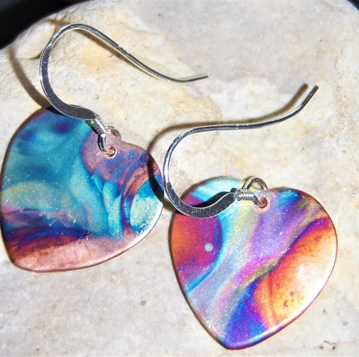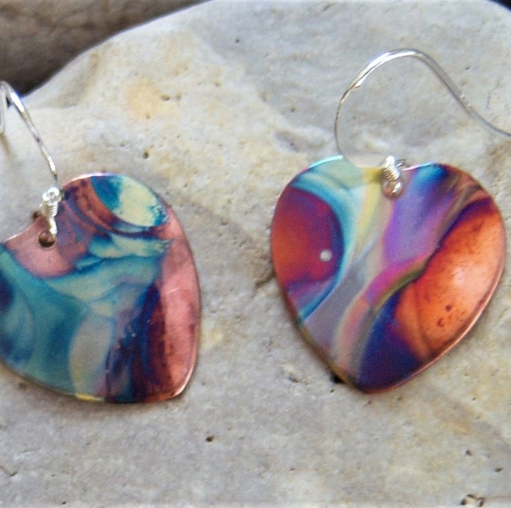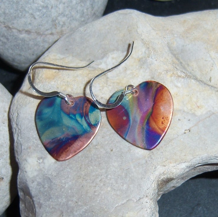 These copper heart shaped earrings are approximately 2cms long. Sterling silver ear wires.