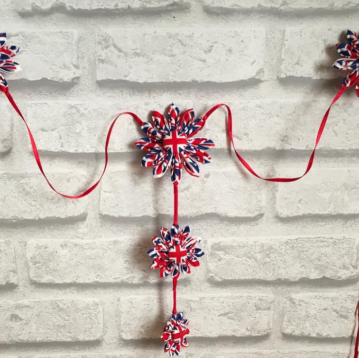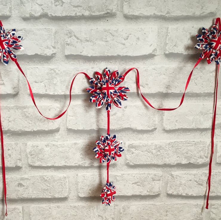 I have this lovely handmade Red, White and Blue bunting which is perfect for celebrating the Queen's Paltinum Jubilee in June. It is made up of 5 flowers in 3 sizes and made from Union Jack cotton fabric. It's approximately 1.5 meters in length, with pieces of narrow satin red ribbon between each flower. In the centre of each flower there is a button showing the Union Jack.
