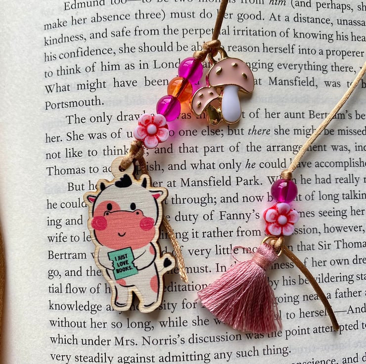 - charms include custom wooden book lover cow charms designed by me!