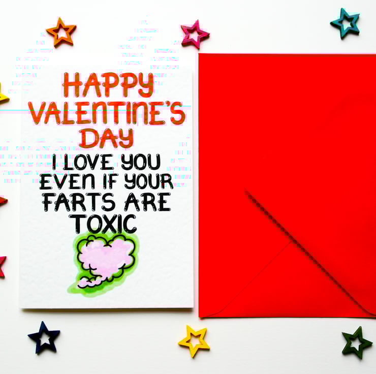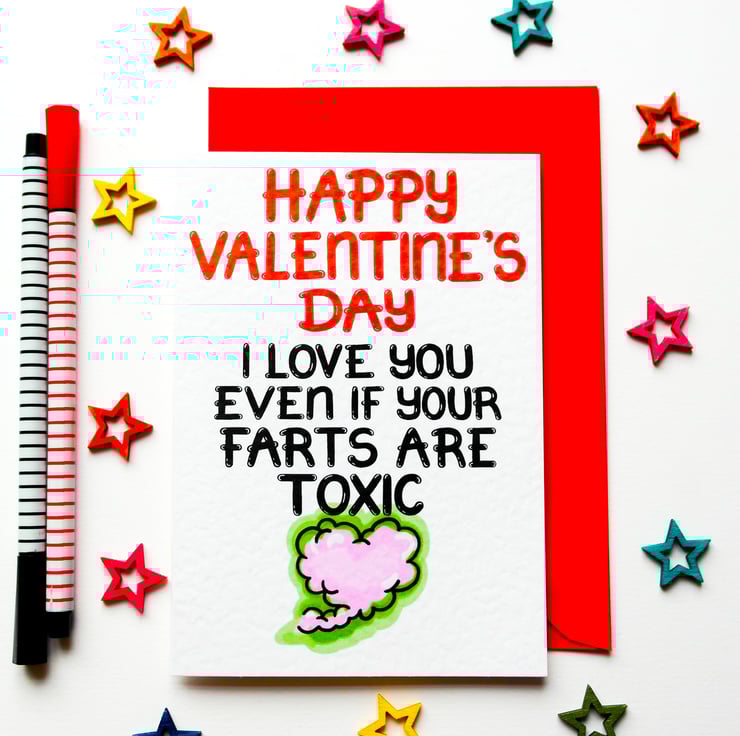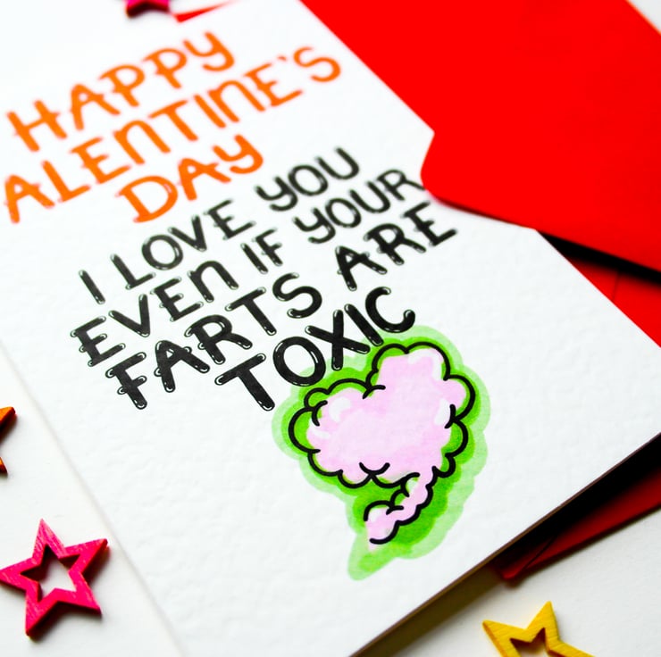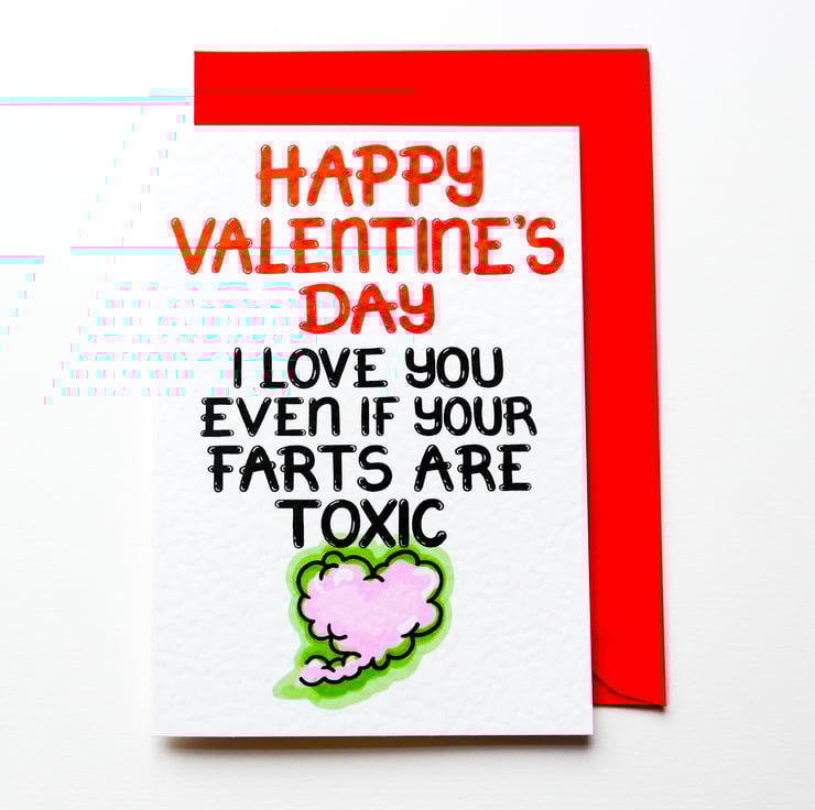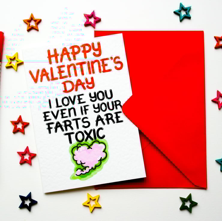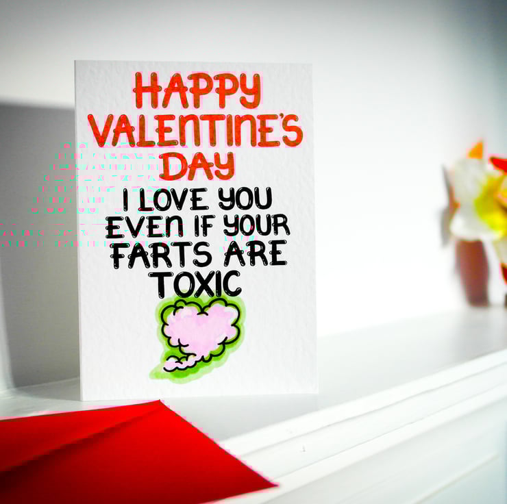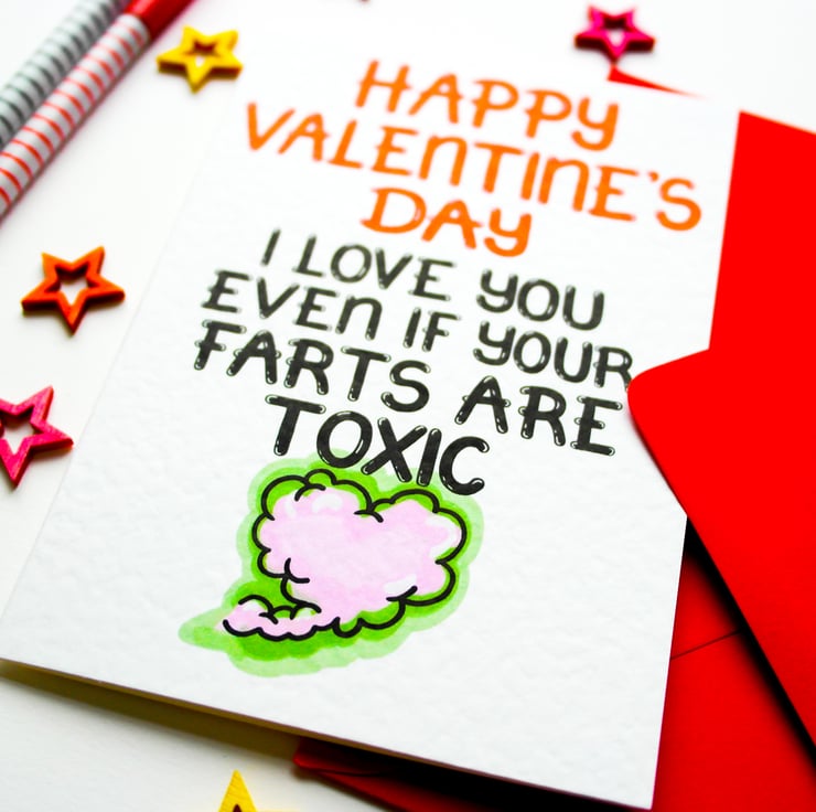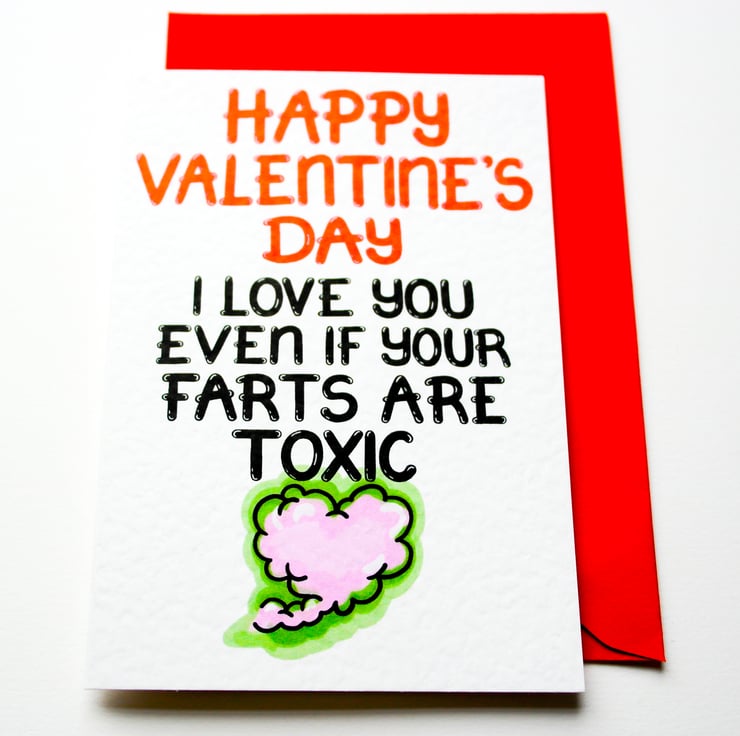 Greeting on front: HAPPY VALENTINES DAY I LOVE YOU EVEN IF YOUR FARTS ARE TOXIC