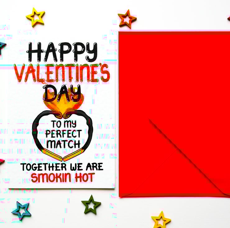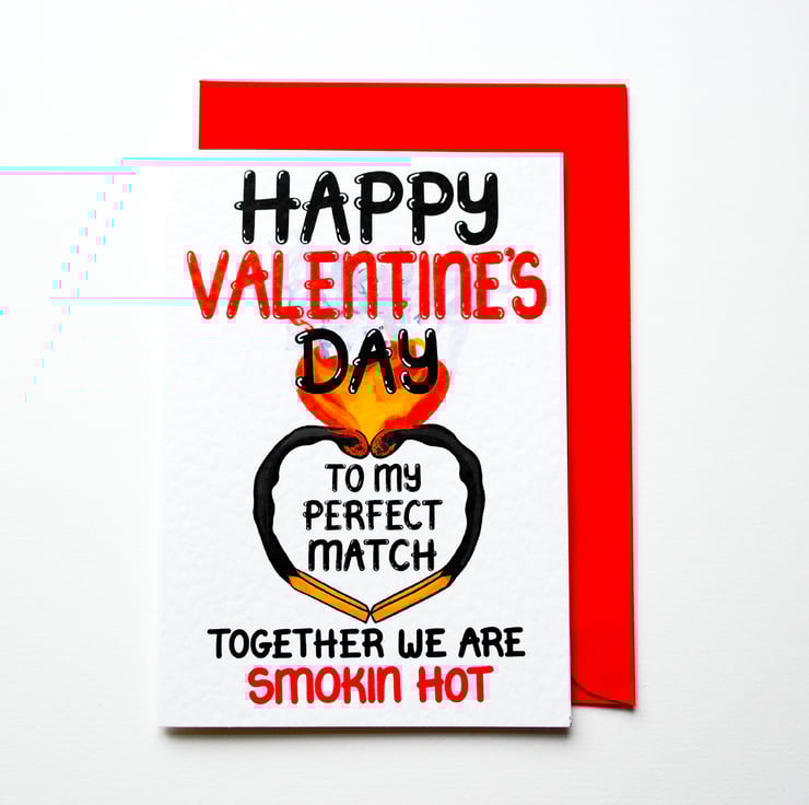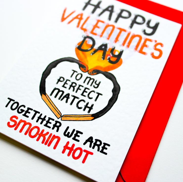Greeting on front: HAPPY VALENTINES DAY TO MY PERFECT MATCH TOGETHER WE ARE SMOKIN HOT