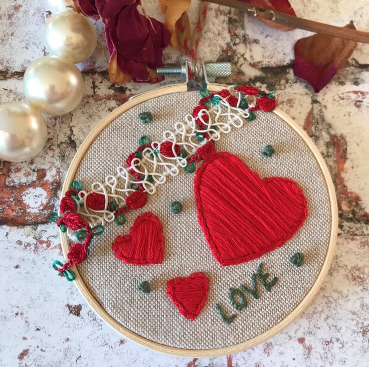 This hoop art is made with a beautiful decorative piece of ribbon with cream swirls, mini red roses and green loops, hand sewn across, then hand embroidered with three different sized red hearts, the word ‘love’ and five French knots in green thread on a linen mix background.