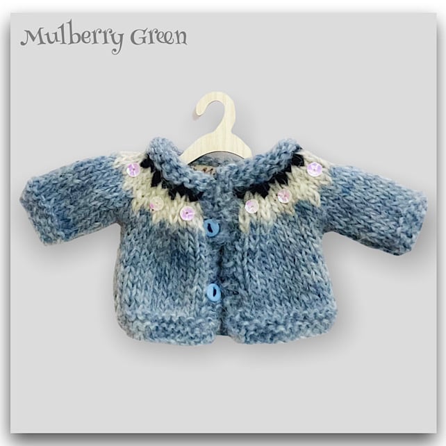 A pretty pale blue cardigan, hand knitted in Lettlopi Icelandic pure wool, to fit the Mulberry Green characters. The cardigan has a patterned yoke, decorated with luminescent sequins and two little buttons. It looks lovely with the dresses in my shop and goes particularly well with denim.