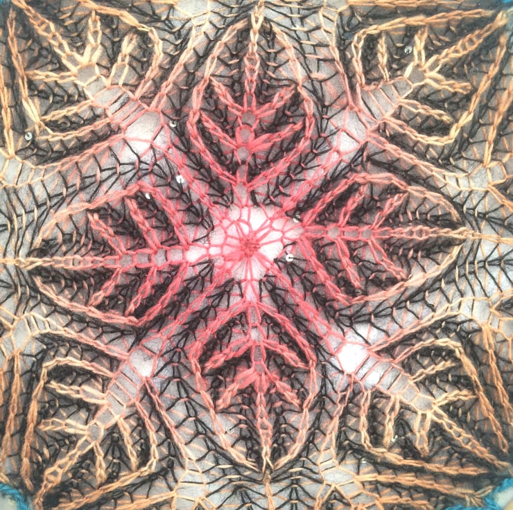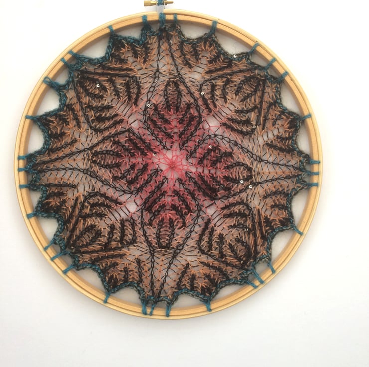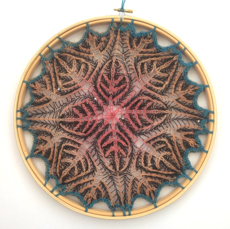 Brioche knitted 2 coloured mandala attached to an 12" embroidery hoop. Yarn used is a mix of orange.yellow/green wool/silk yarn and black fine kid mohair/ silk with tiny sequins.