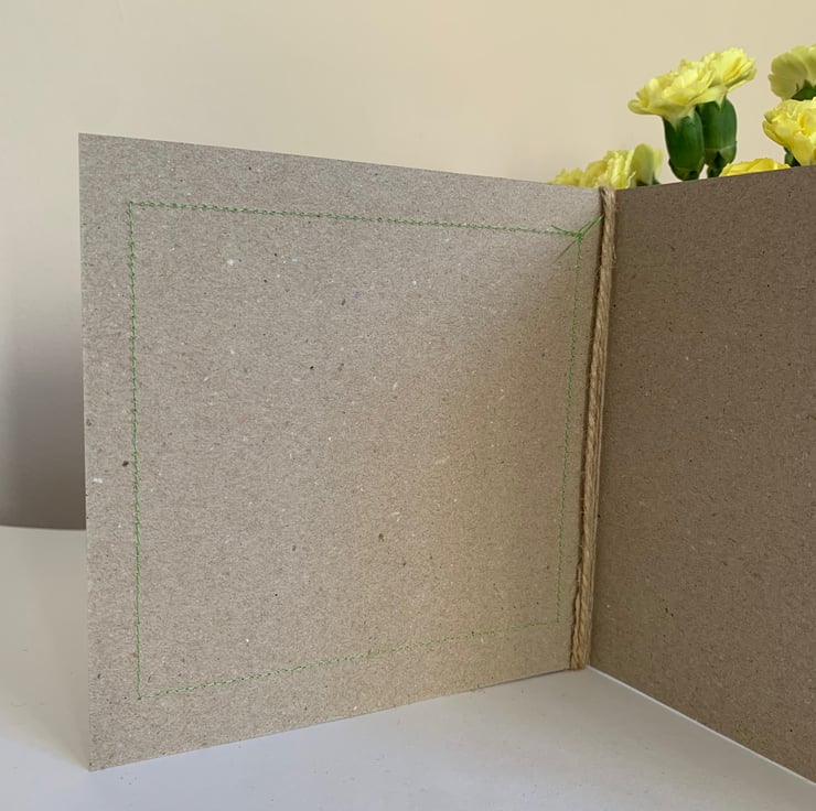 The hessian is machine stitched, using a contrasting thread, onto a plain brown recycled card. This stitching is visible on the inside of the card.