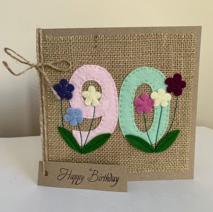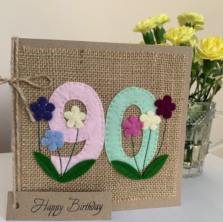 A unique handmade card for a special birthday. The numbers for this 90th birthday are hand cut from pale pink and mint green acrylic felt and hand sewn to a hessian background. Flowers, hand cut from wool felt, in pinks, purples and cream are added to decorate the card.