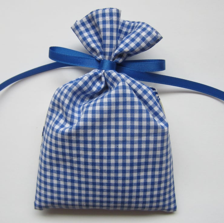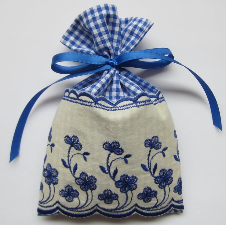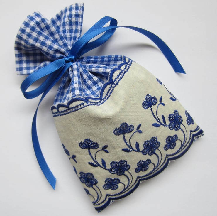 Lavender drawer sachet made from blue and white gingham and decorated with a vintage embroidered blue flower design trim.