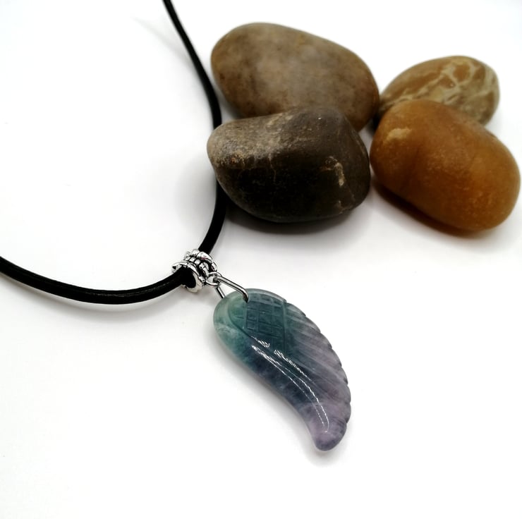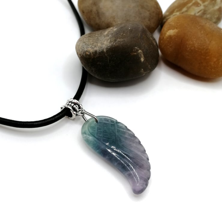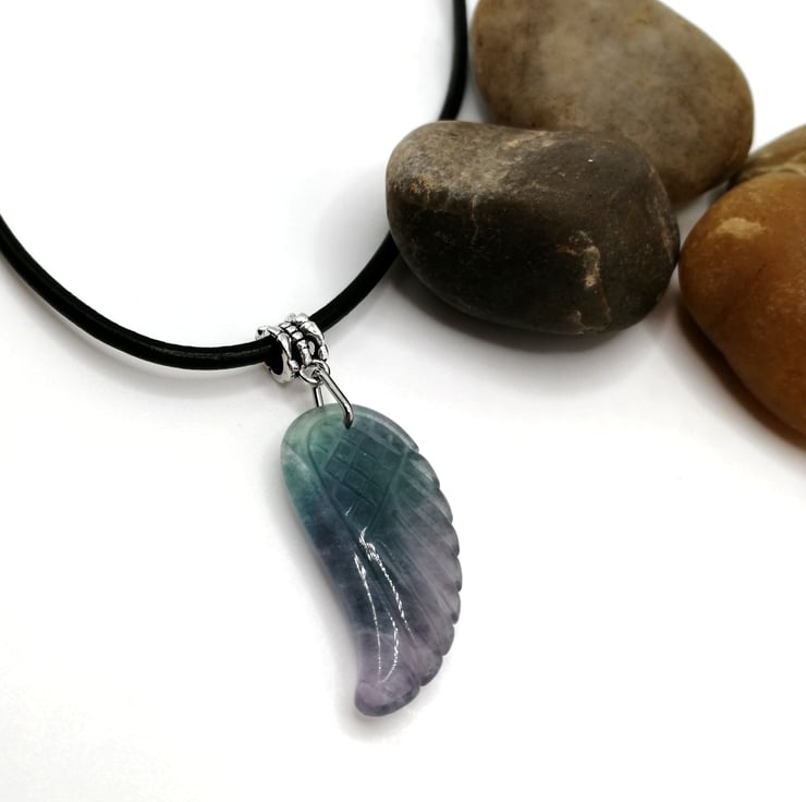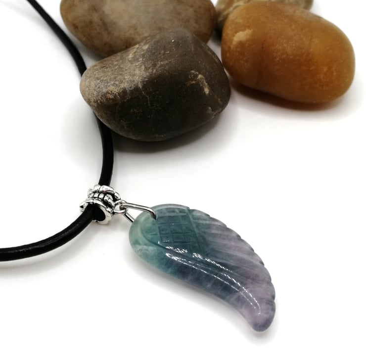 This beautifully carved angel wing is made from fluorite. The butterfly at the bottom is glass. Please leave me a message with your choice of necklace length and type. I am able to offer black or brown leather or silver plated chain. If I don't receive a message I will send a 18 inch black leather necklace.