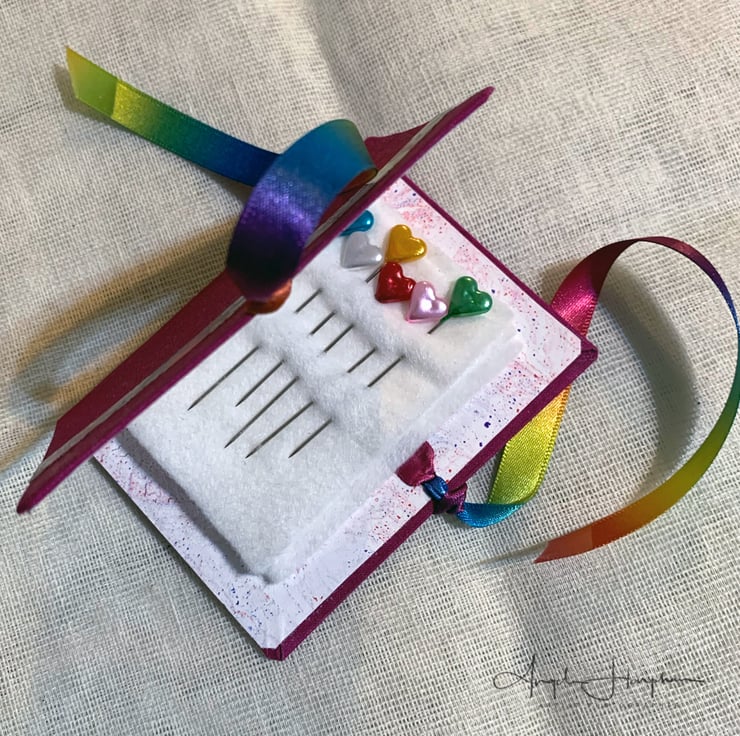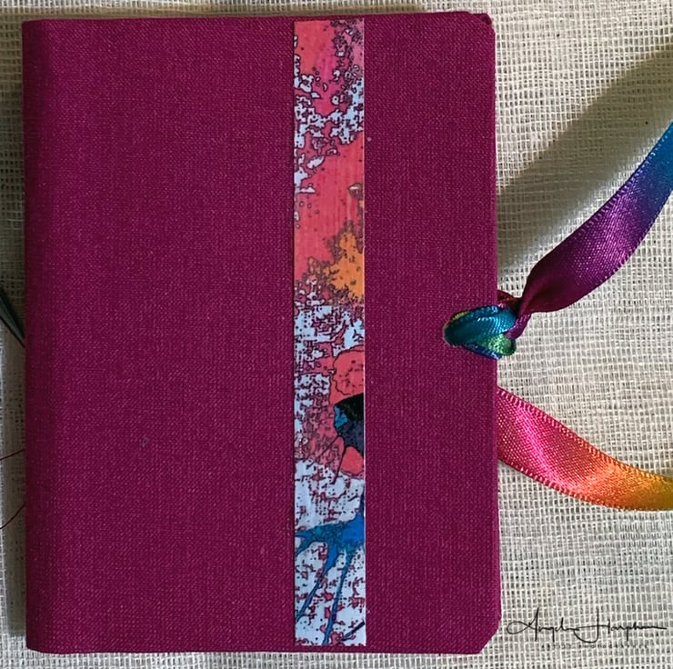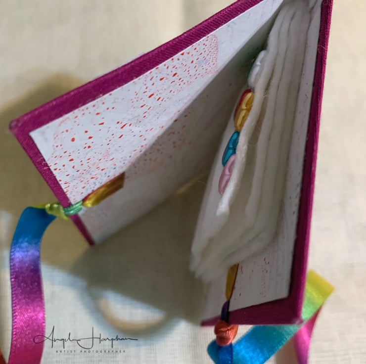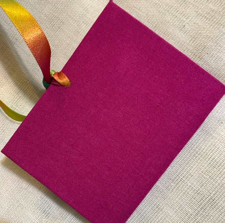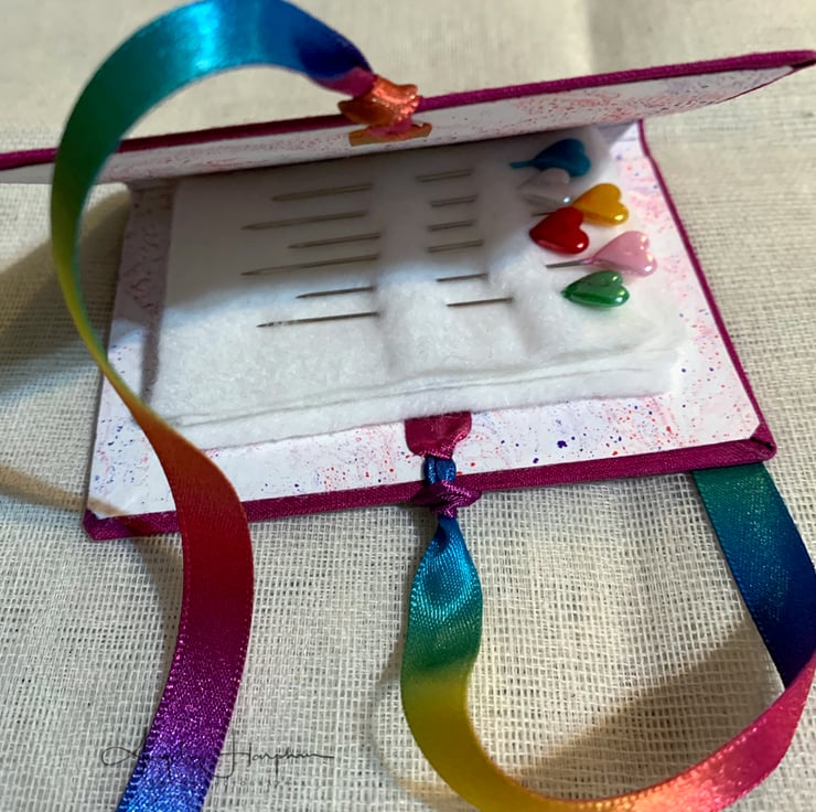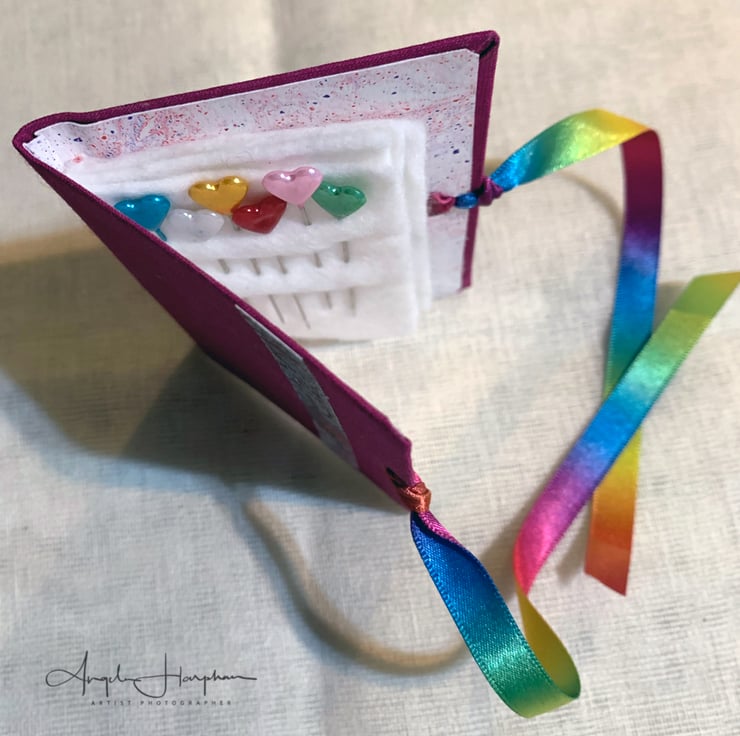 A lovely hand made needle case covered in quality book cloth and embellished on the front with a strip of my ink artwork. It has beautiful double sided rainbow ribbon ties. The ends of the ribbons are dipped in wax to prevent the edges fraying, It has my marbled paper on the inside, and four leaves of white felt.